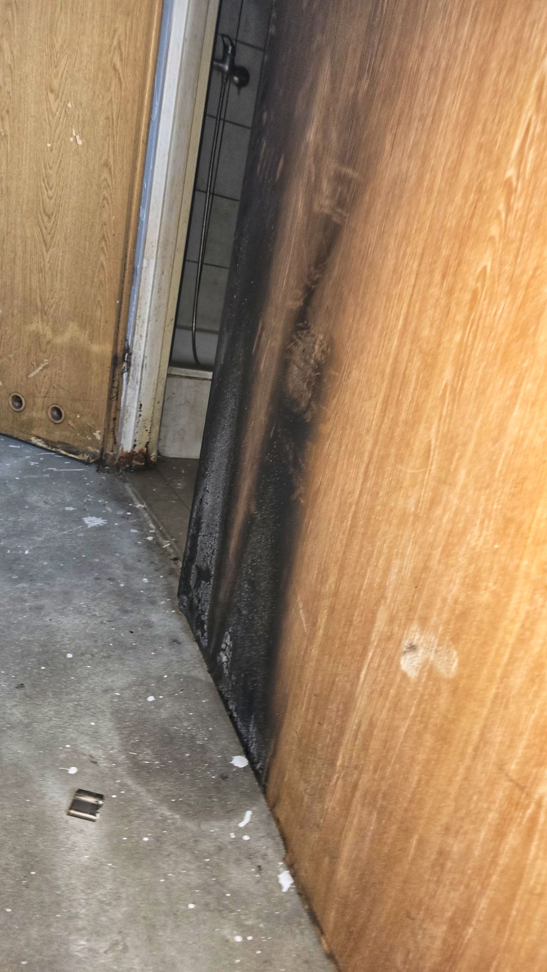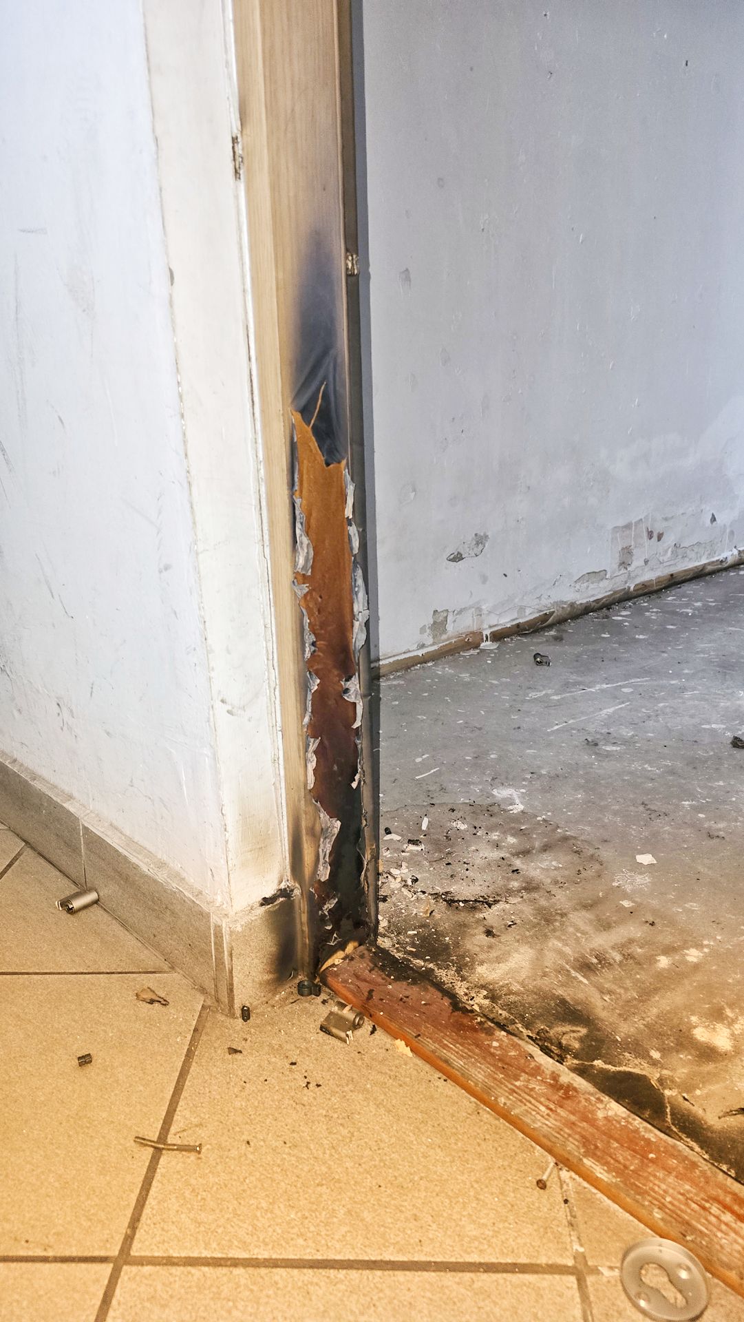 Po przybyciu na miejsce strażacy potwierdzili obecność dymu na wspólnym korytarzu parterowego budynku. Rozpoczęto poszukiwania źródła zagrożenia, które doprowadziły do drzwi mieszkania numer 9. Na ich dolnej części widoczne były ślady podpalenia, co wskazywało na celowe działanie sprawcy.