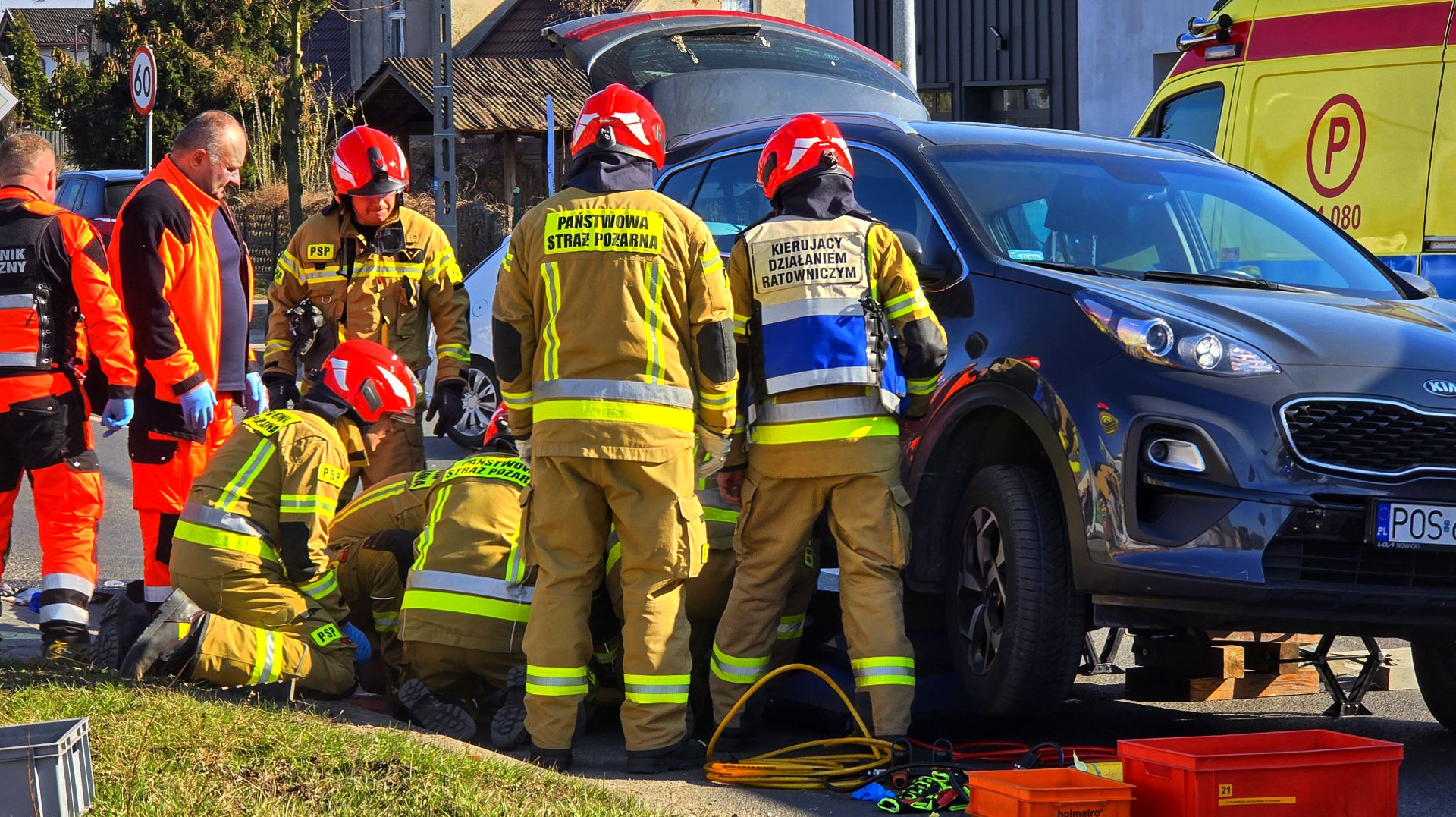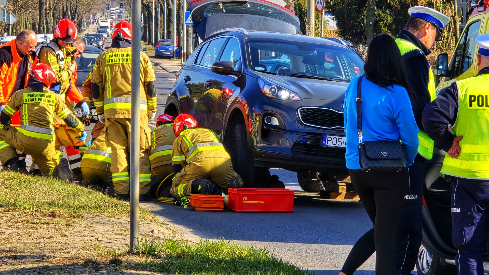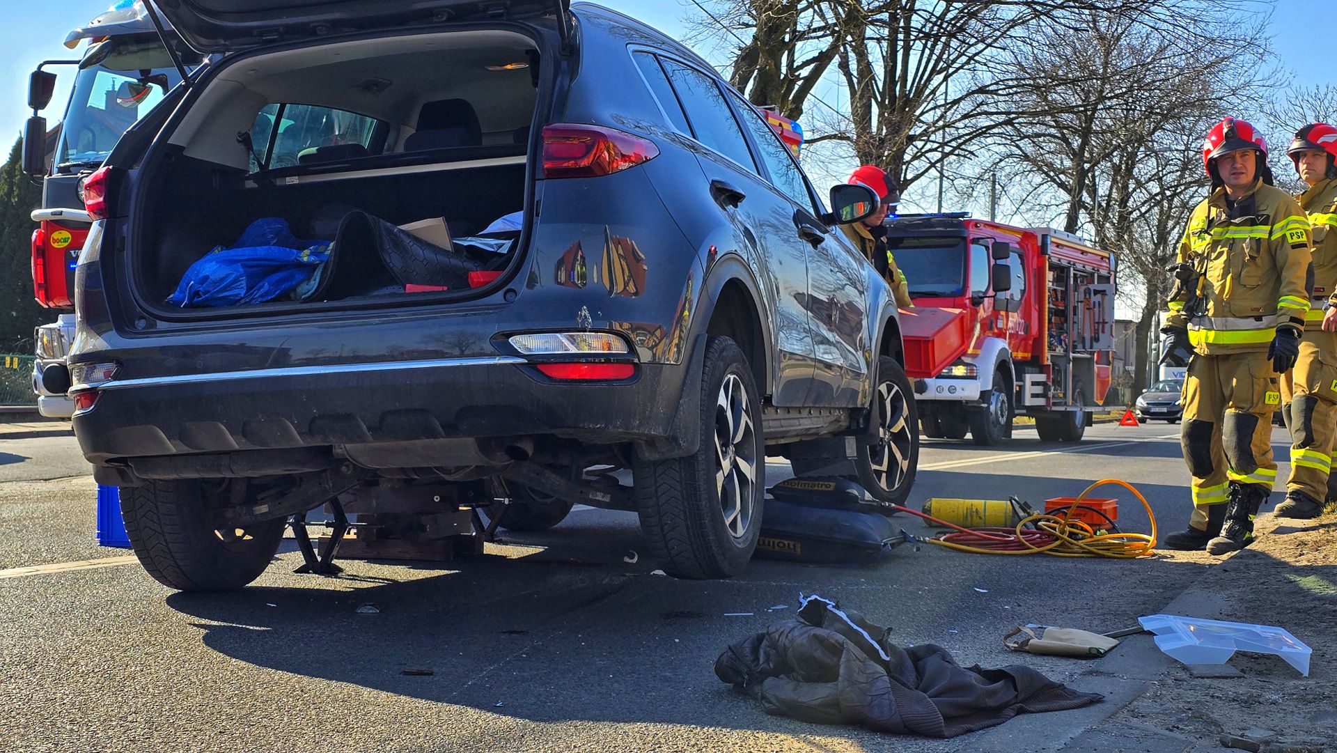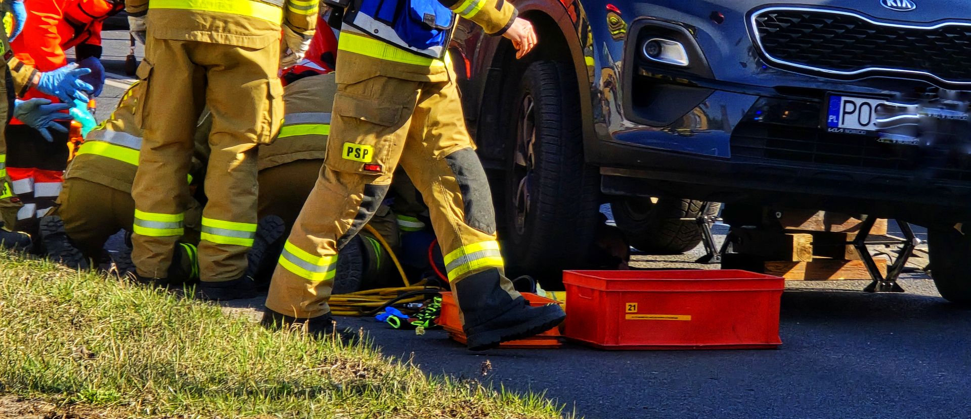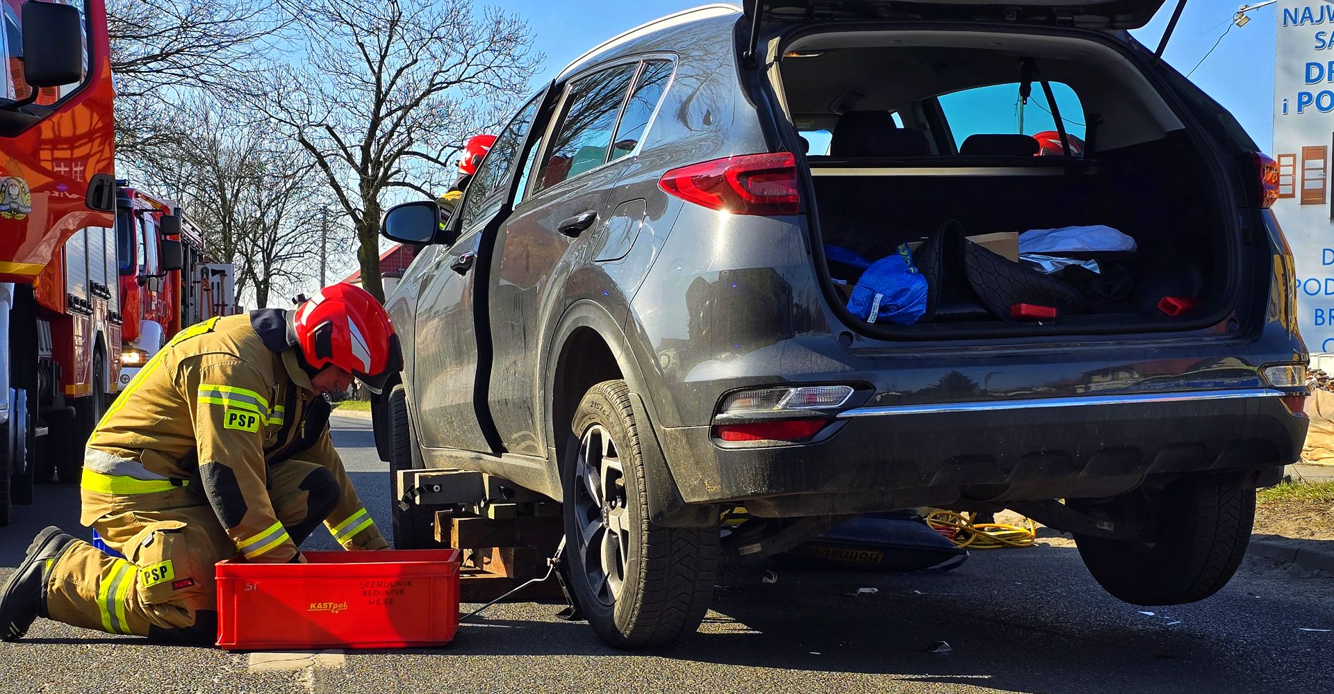Na miejsce natychmiast wezwano służby ratunkowe. Strażacy, używając poduszek pneumatycznych, podnieśli samochód i wydobyli poszkodowanego. Następnie przekazano go zespołowi ratownictwa medycznego.