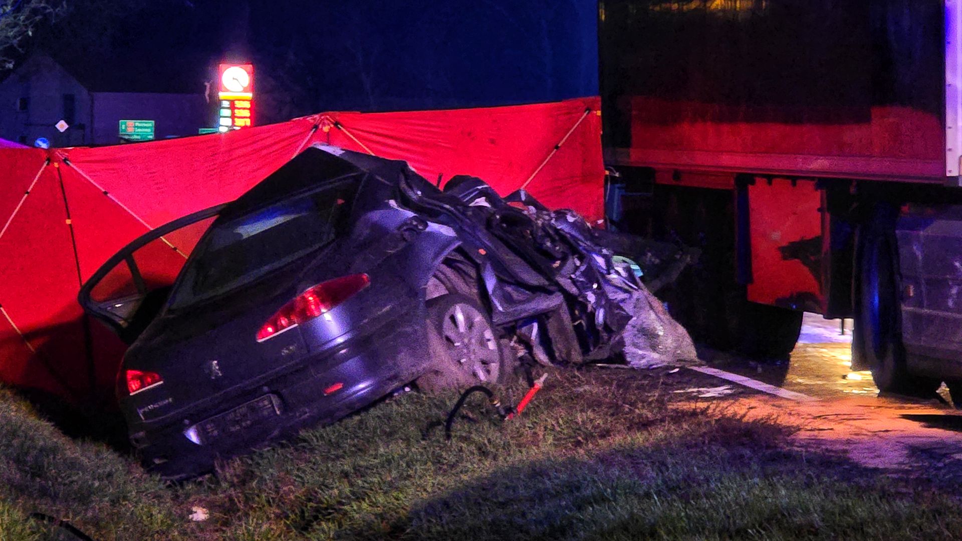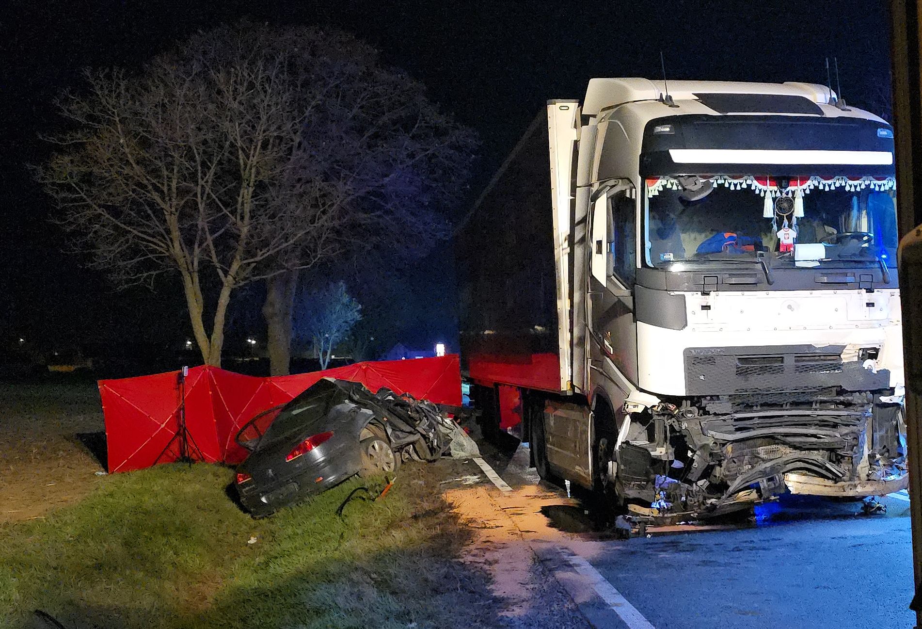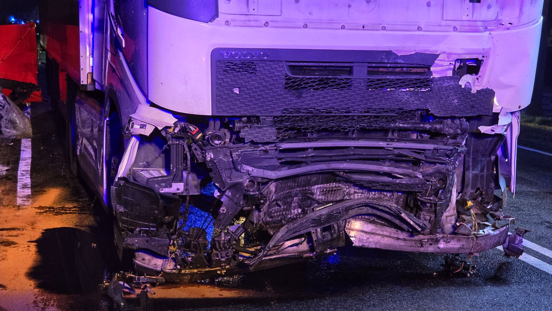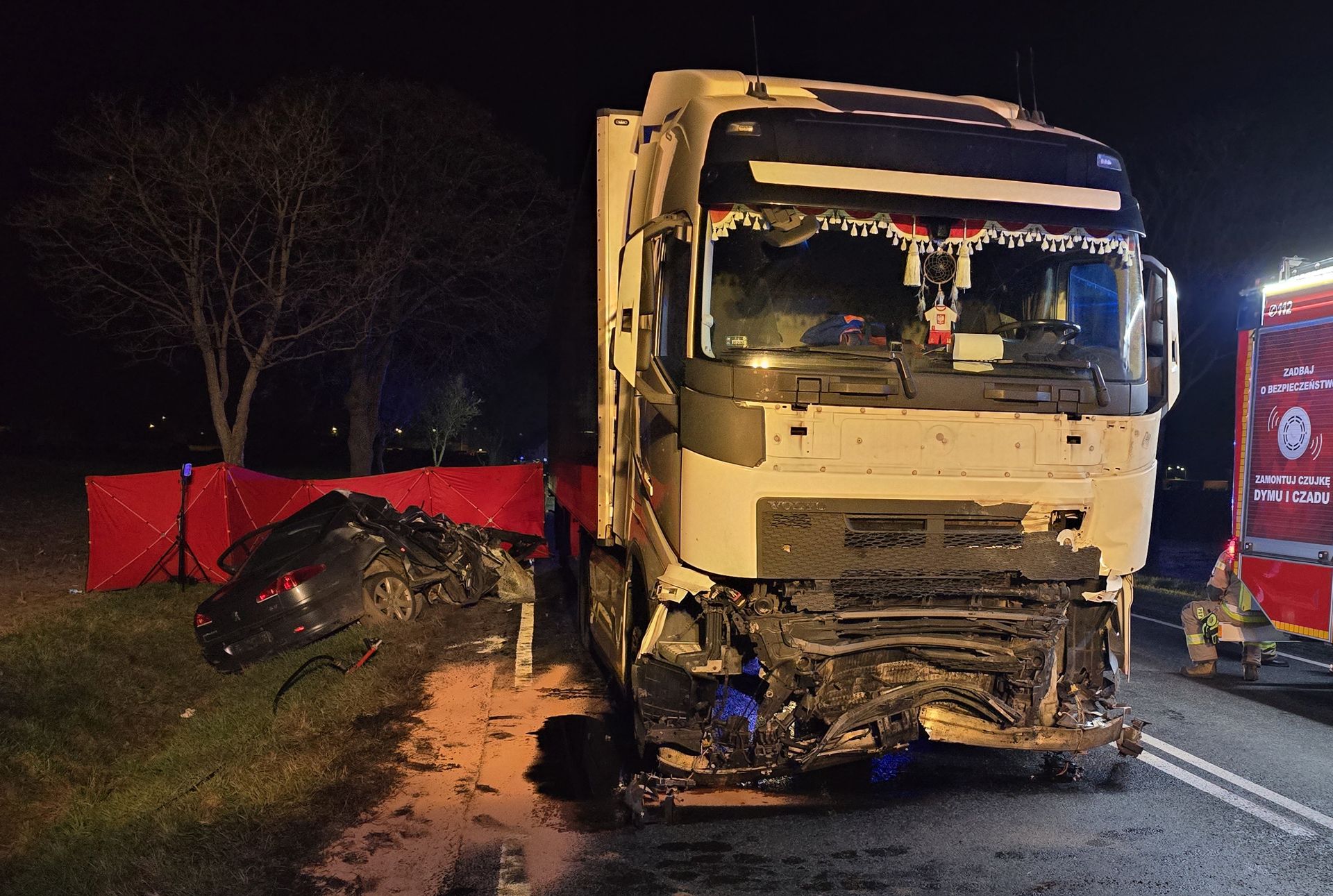 Siła uderzenia była duża. Kierowca nie przeżył zderzenia. Miał około 42 lat. Kierowcom ciężarówek nic się nie stało. Droga została zablokowana.