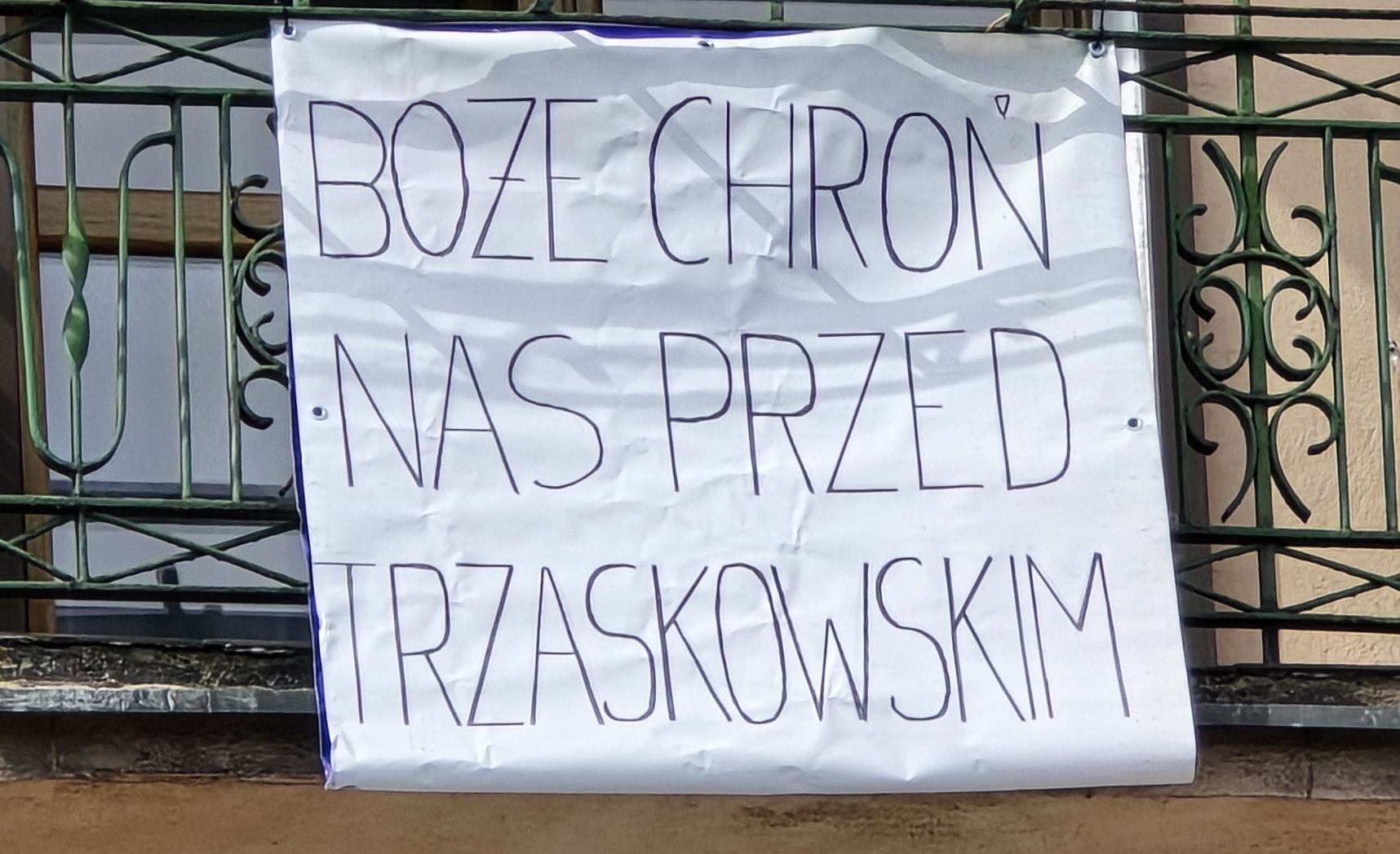 W tłumie pojawiły się transparenty o wyraźnie negatywnym wydźwięku: „Tęczowy Rafał – Ręce precz od DZIECI”, „Boże chroń nas przed Trzaskowskim” czy „Trzaskowski: 1) Pierwszy aborcjonista 2) Lewakiem, którego pragnieniem są śluby dla par jednopłciowych”. Część protestujących podnosiła argument, że plac św. Józefa to miejsce o charakterze religijnym i że obecność kandydata o liberalnych poglądach jest tam nie na miejscu.
