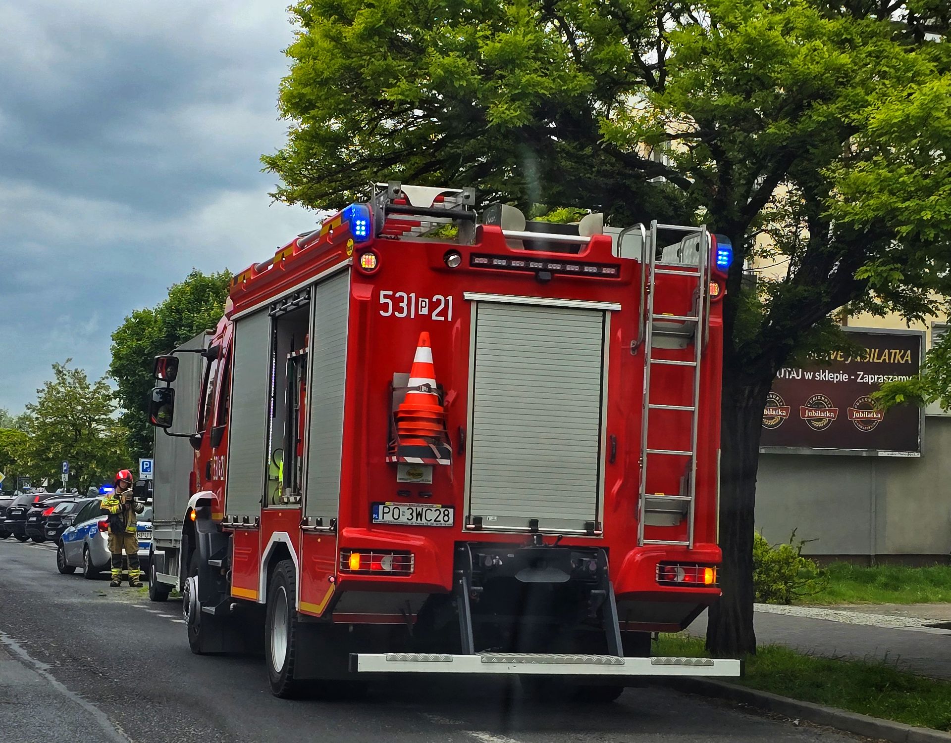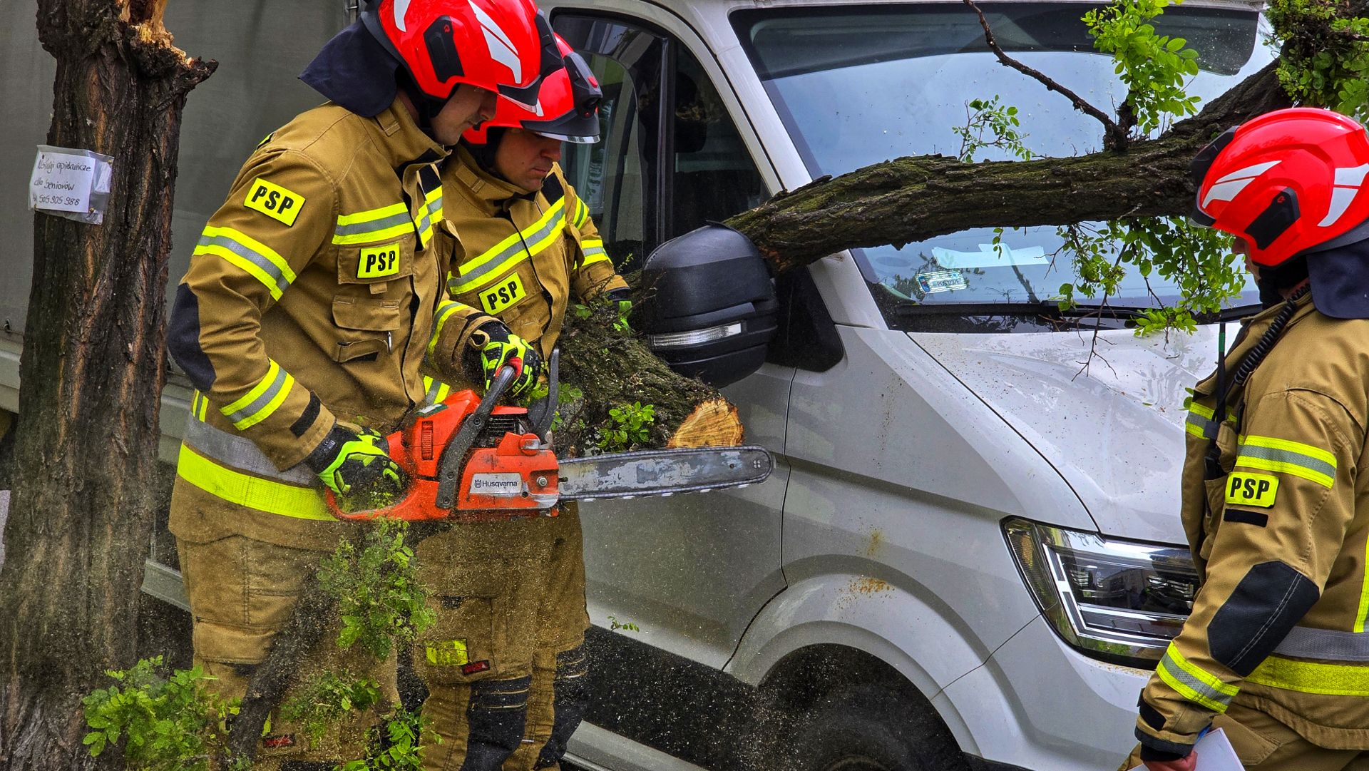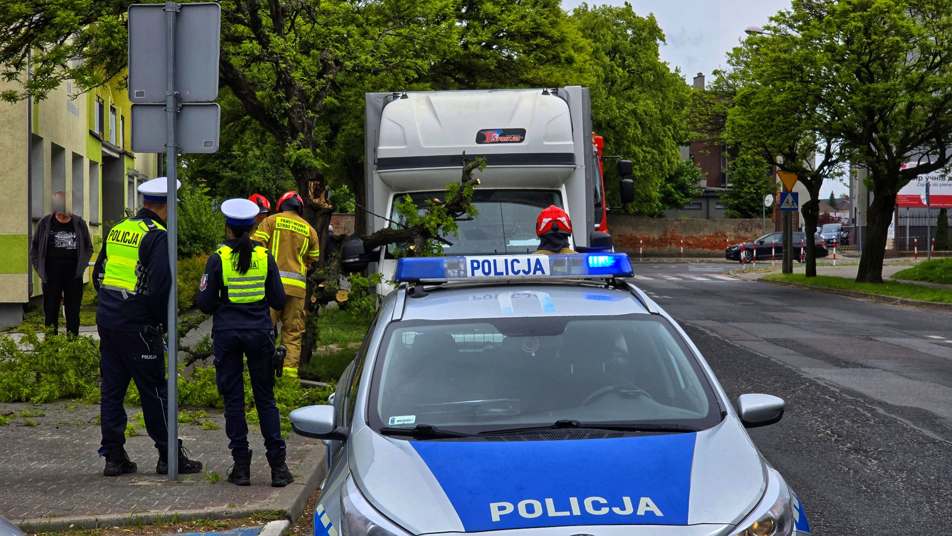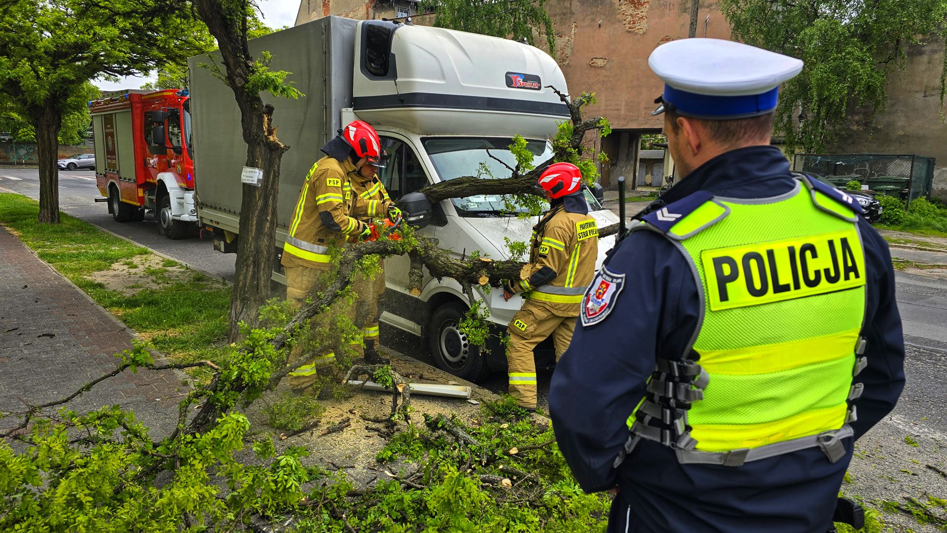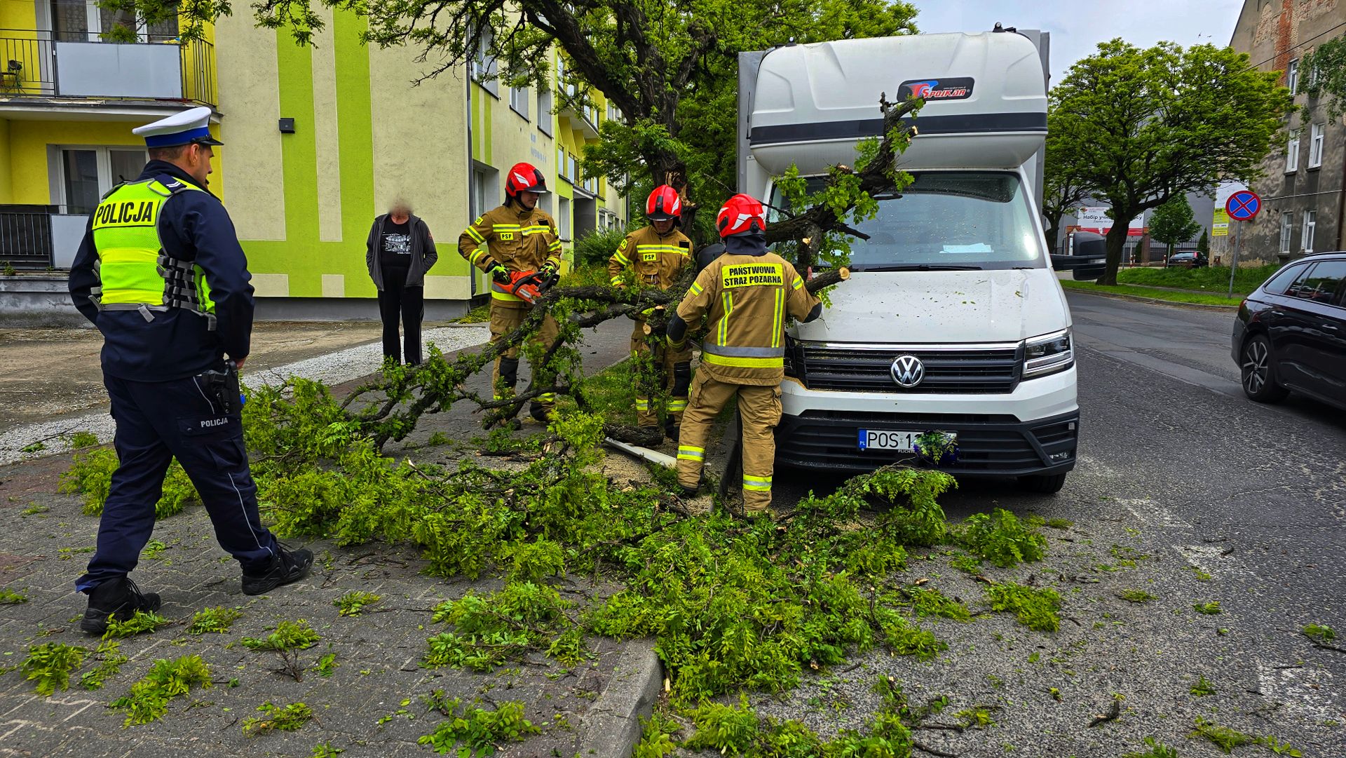 Gałąź była na tyle duża, że zaklinowała się na pojeździe, uniemożliwiając jego usunięcie bez specjalistycznej pomocy. Na miejsce wezwano straż pożarną. Przy użyciu piły łańcuchowej sprawnie usunięto zagrożenie.