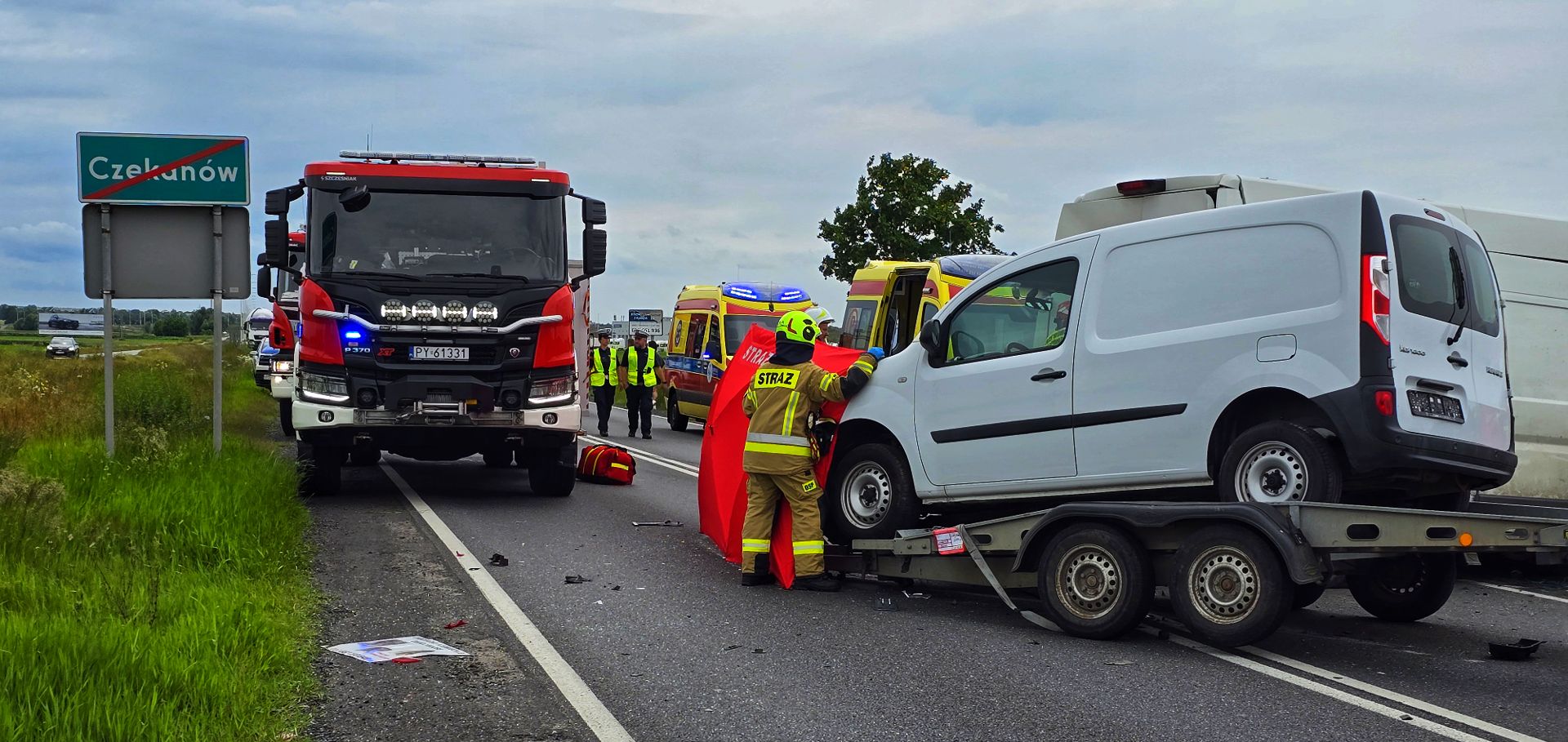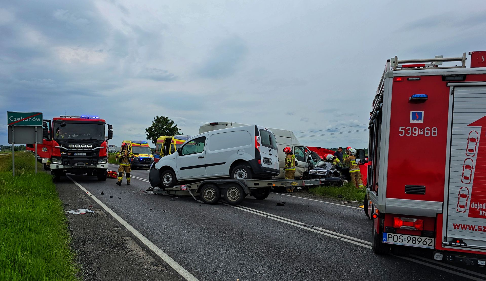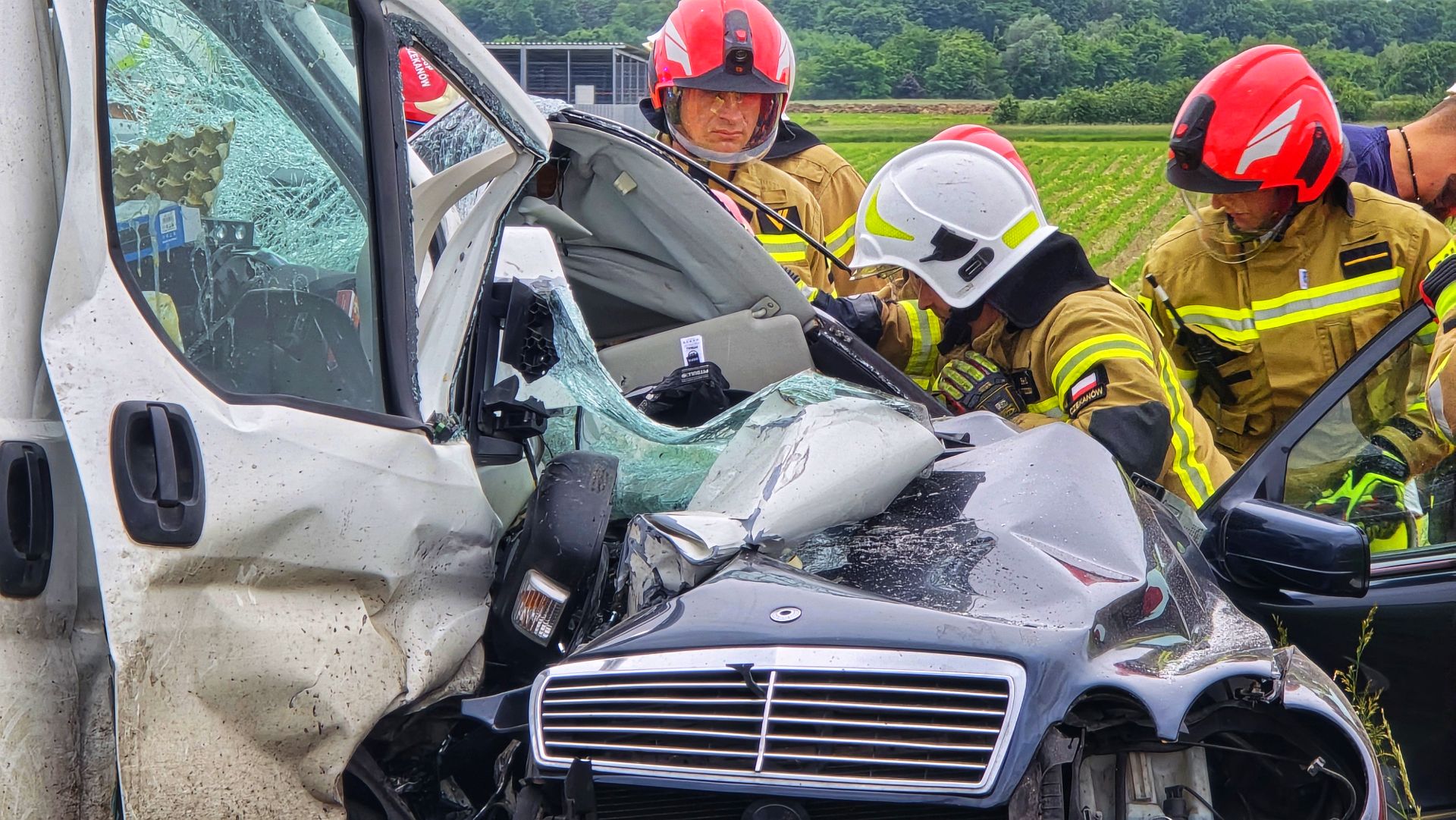 Przed godziną 14 doszło do bardzo poważnego wypadku na wjeździe do Czekanowa od strony Ostrowa Wielkopolskiego. Z nieznanych przyczyn kierowca Mercedesa gwałtownie zjechał na przeciwny pas ruchu i zderzył się z busem, który ciągnął na lawecie samochód dostawczy.