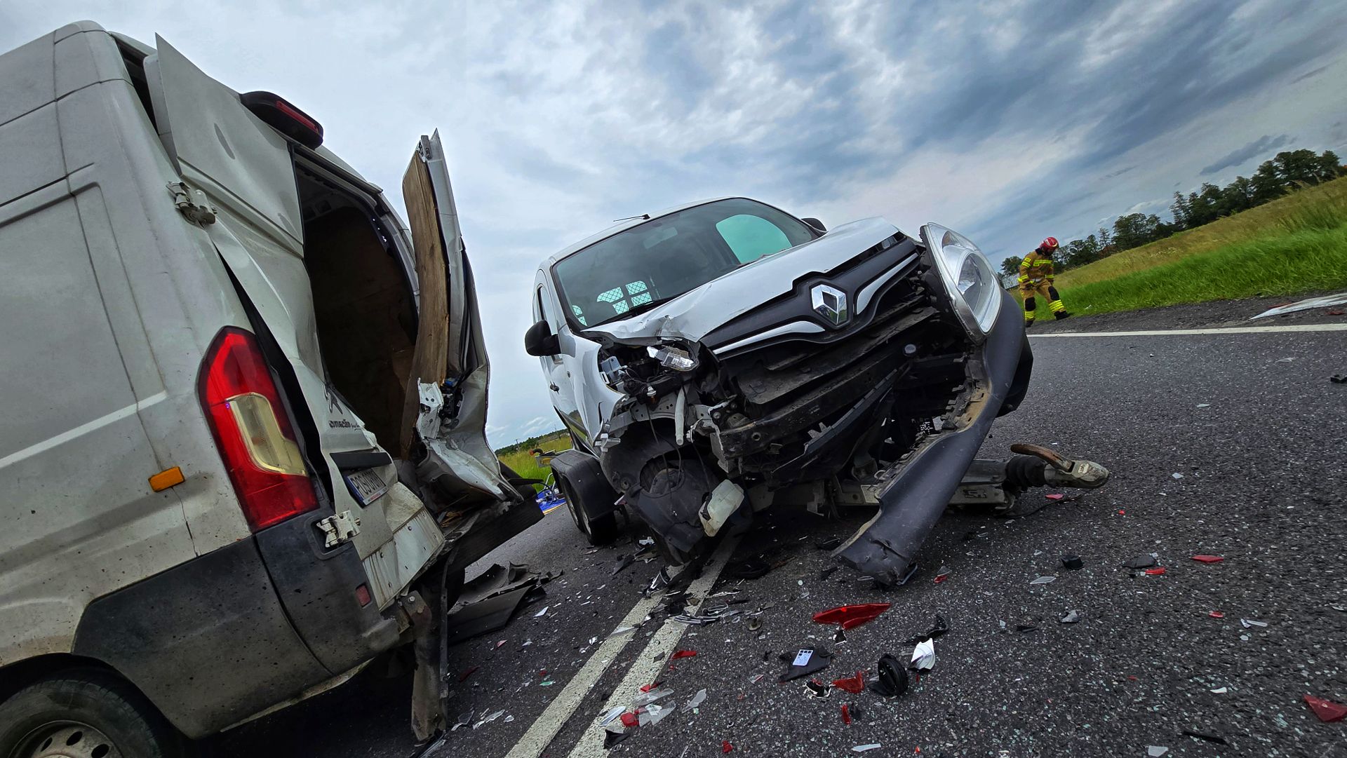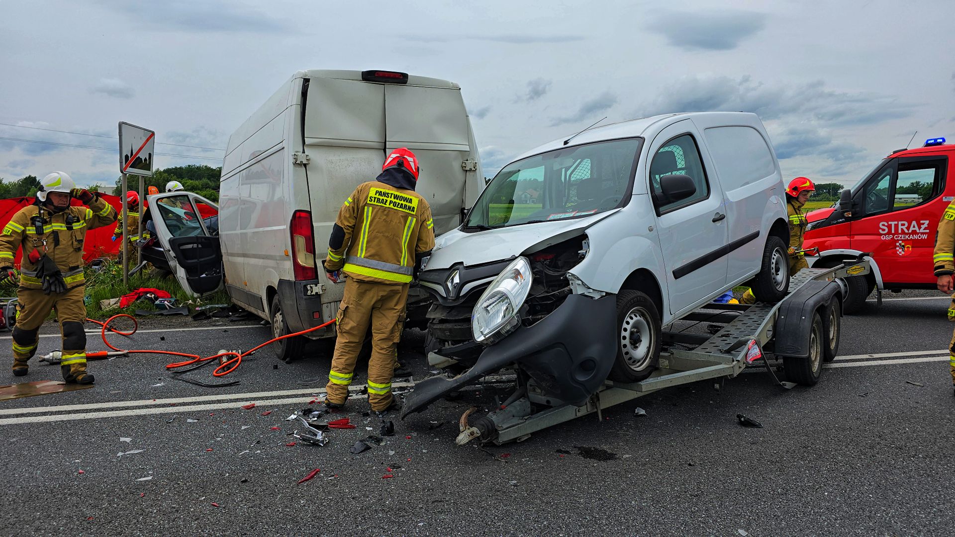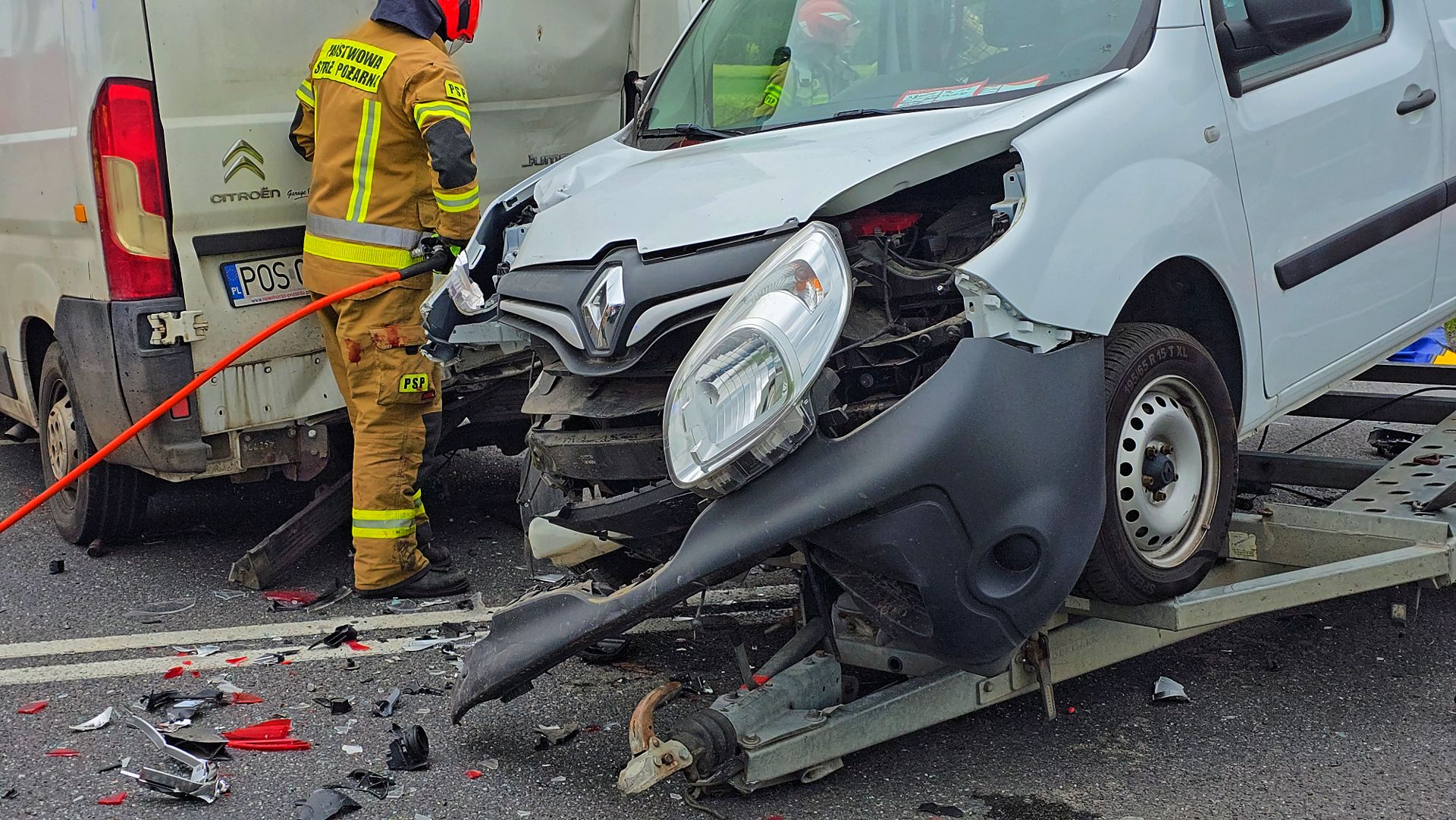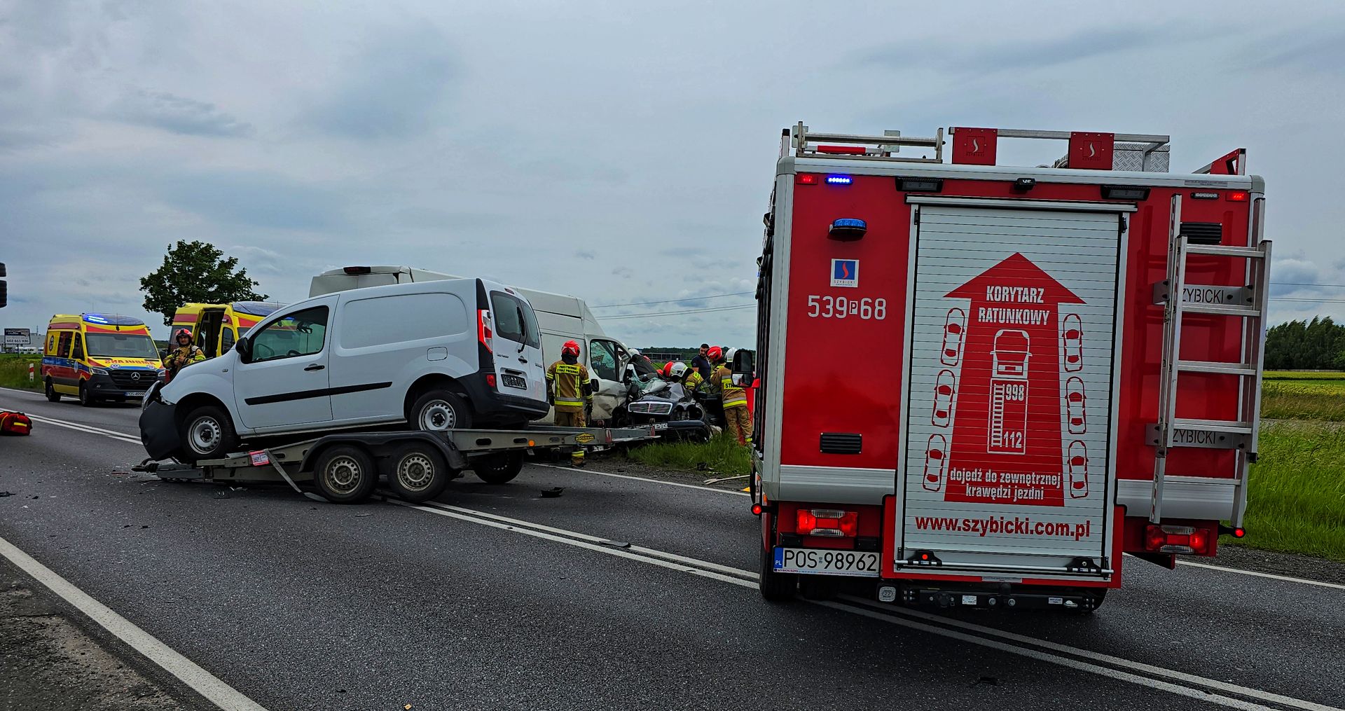 Przed godziną 14 doszło do bardzo poważnego wypadku na wjeździe do Czekanowa od strony Ostrowa Wielkopolskiego. Z nieznanych przyczyn kierowca Mercedesa gwałtownie zjechał na przeciwny pas ruchu i zderzył się z busem, który ciągnął na lawecie samochód dostawczy.