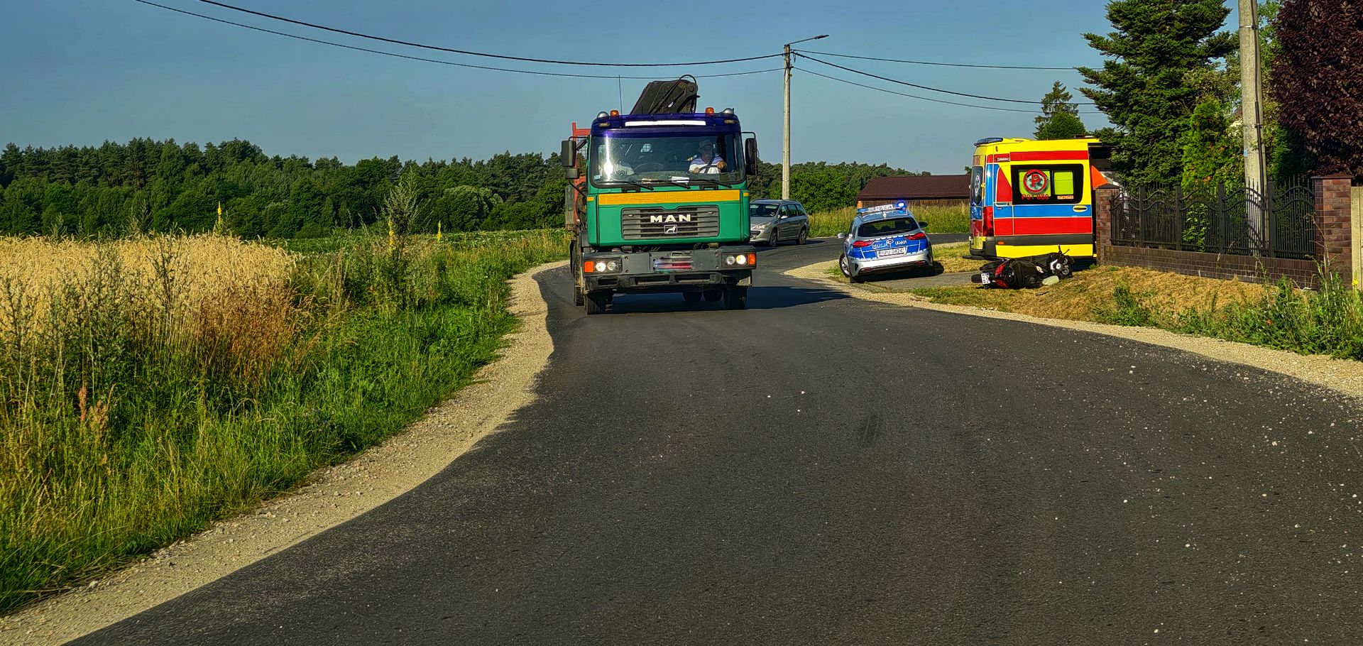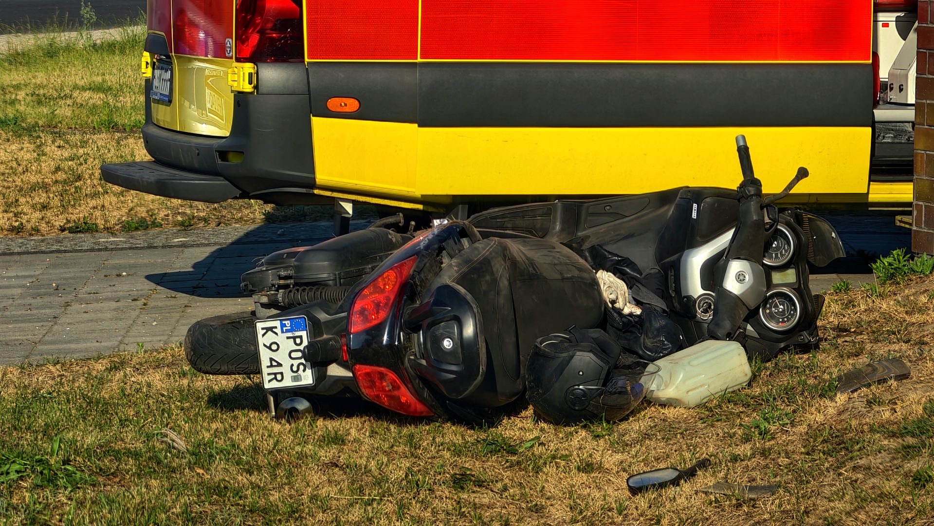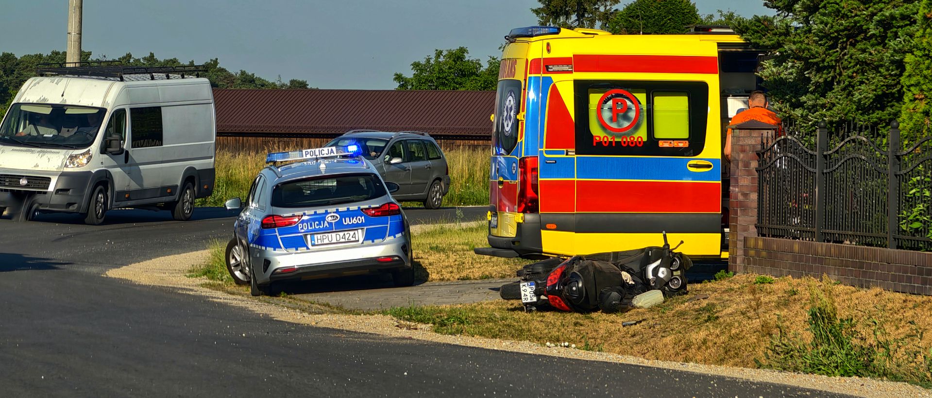 67-letni mężczyzna kierujący jednośladem doznał poważnych obrażeń. Zespół ratownictwa medycznego przetransportował poszkodowanego w stanie ciężkim do ostrowskiego szpitala – przewóz odbył się na sygnałach.