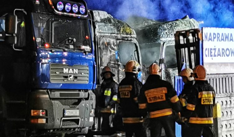 Kiedy strażacy z OSP Czekanów dotarli jako pierwsi na miejscu stwierdzili pożar dwóch ciągników od aut ciężarowych. Płomienie zaczęły docierać do budynku warsztatu. Na szczęście udało się go opanować i uniknąć kolejnych strat. Nadpalony został wózek widłowy.