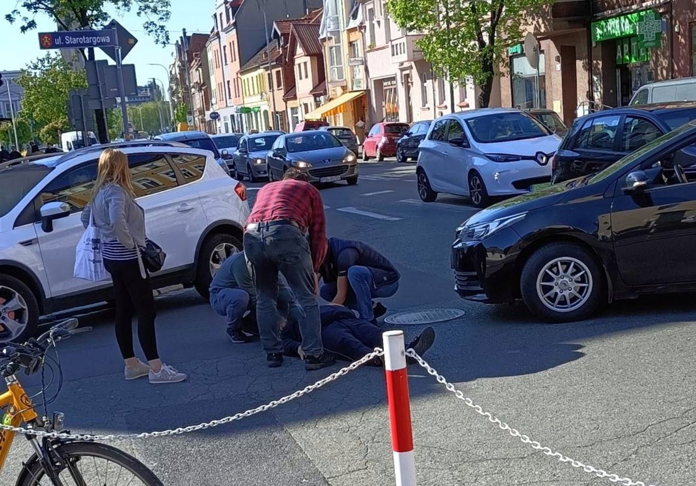 Rowerzysta jechał od strony kościoła pw. św. Antoniego do punktu PTTK. Z przeciwka od strony Rynku dojeżdżała toyota, której kierowca chciał skręcić w lewo w Starotargową. Nie dostrzegł rowerzysty i uderzył w niego. Mężczyzna upadł na lewe biodro. Na miejsce wezwano karetkę pogotowia ratunkowego oraz dwa patrole drogówki.