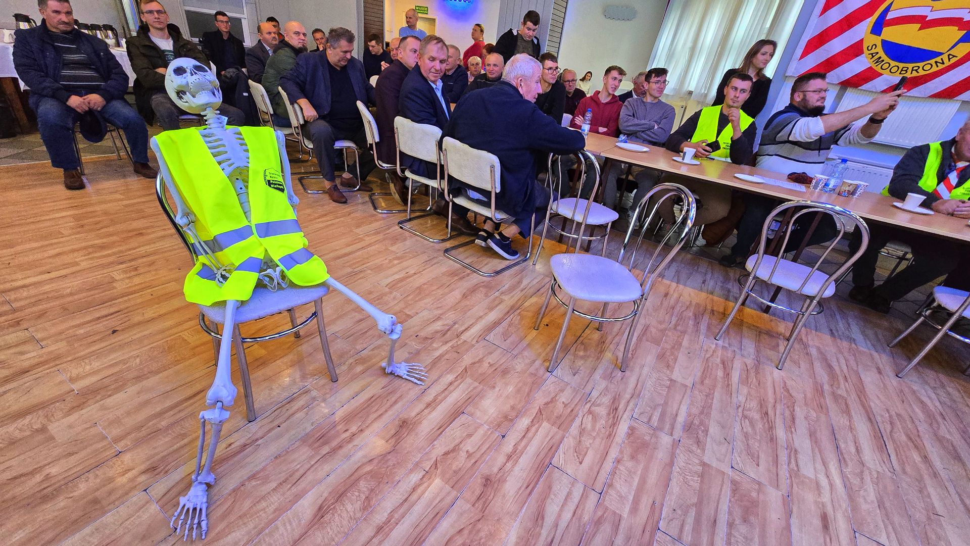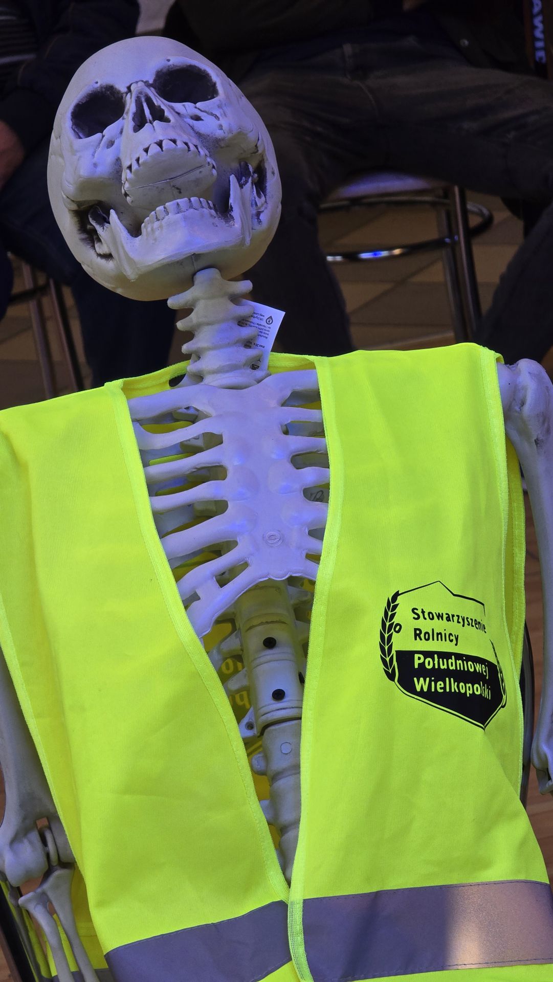 Na szkielecie znalazła się kartka z tekstem: „Stan Konsumentów po podpisaniu umowy Mercosur 19.11.2024. Europa będzie wymieniać swój przemysł za żywność bez jakości. Wszystko kosztem konsumentów i rolnictwa. „Zdobywać majątek za cenę zdrowia znaczy to samo, co odciąć sobie nogi, by kupić za nie parę butów” – Prentice Mulford.