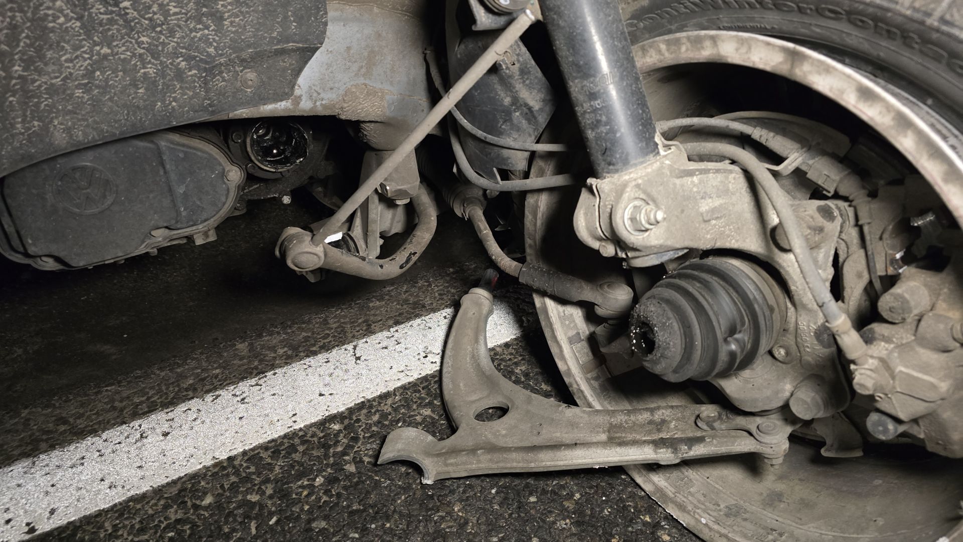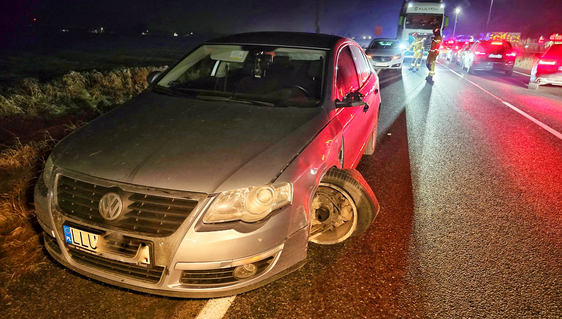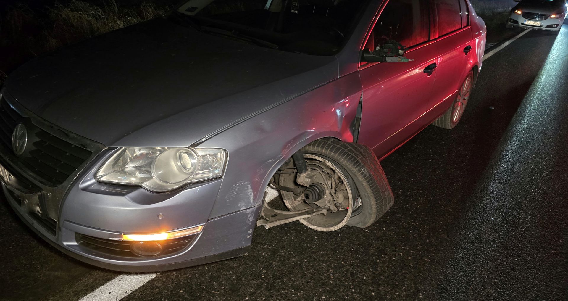W Volkswagenie oderwało się koło. Trwa ustalanie czy najpierw się oderwało koło czy w wyniku zjechania kierowcy Volkswagena na przeciwny pas ruchu i kontaktu obu pojazdów.