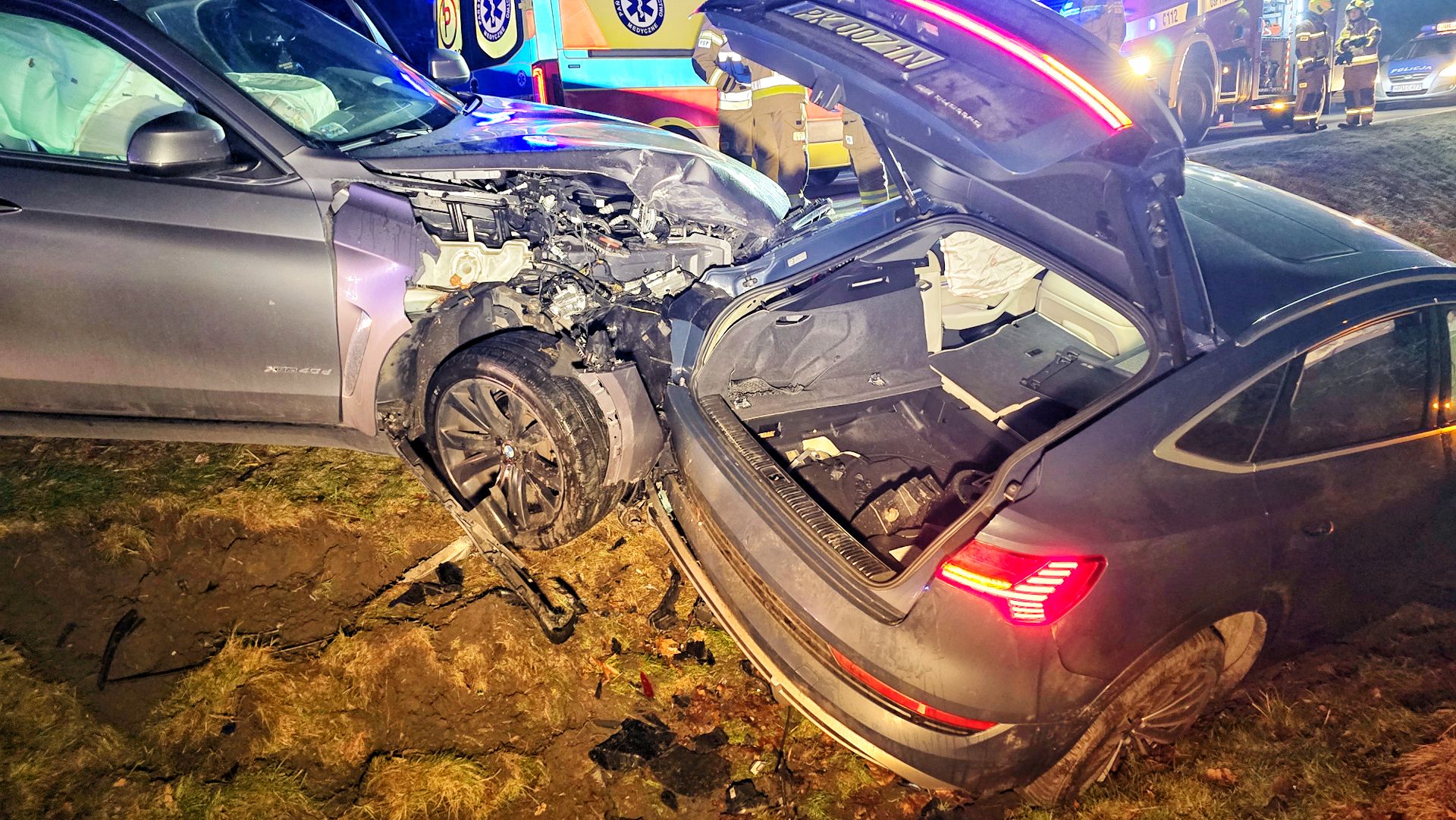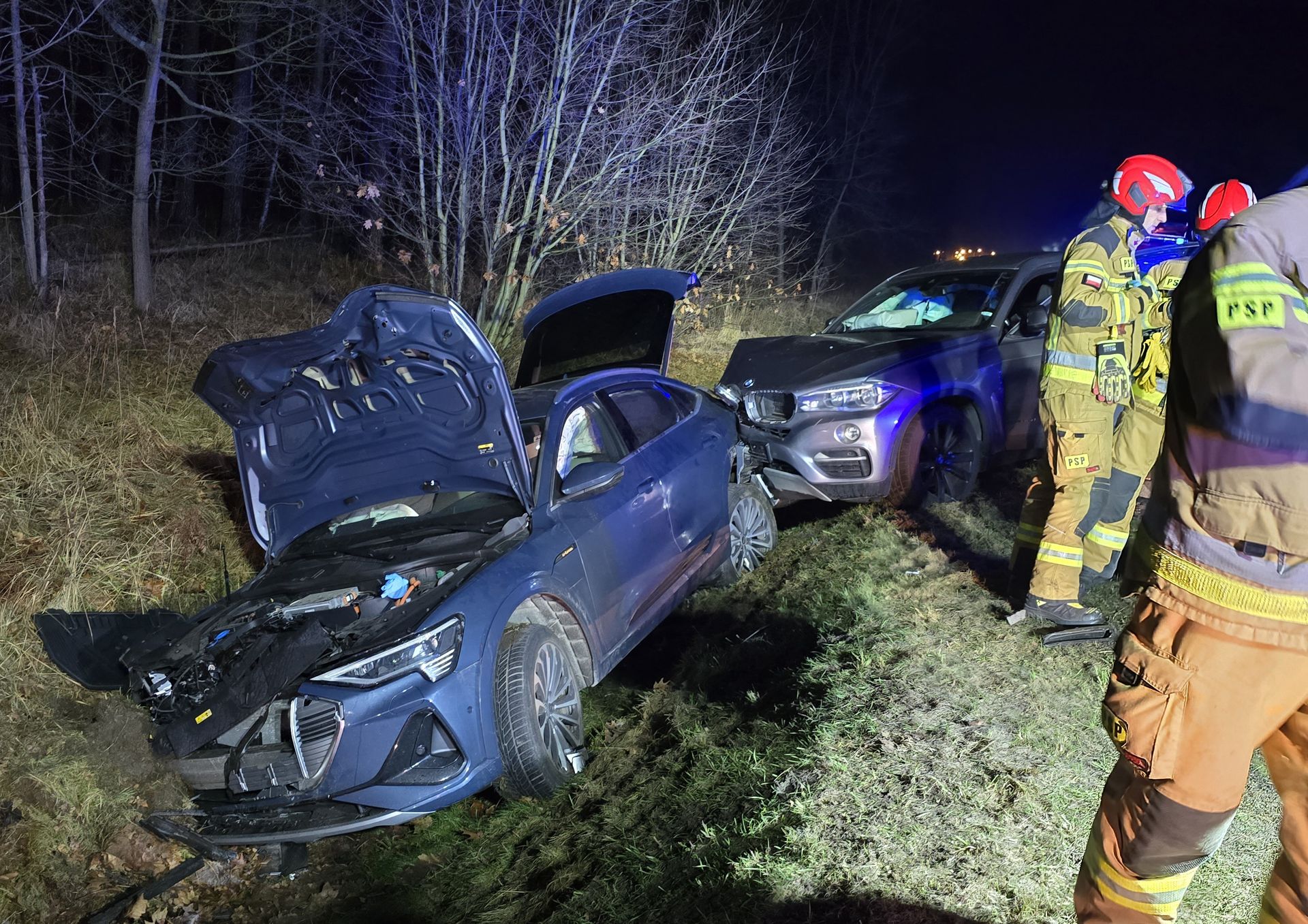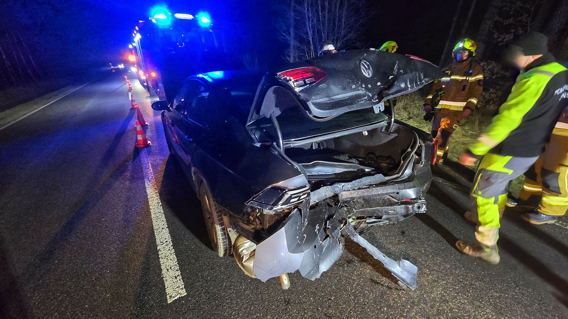 Młody kierowca Volkswagena Passata awaryjnie zahamował z powodu przebiegających saren. Za nim zatrzymał się elektrycznym Audi, ale niestety w tył Audi uderzyło BMW. Passat ma mocno uszkodzony tył, Audi przód i tył a BMW przód.