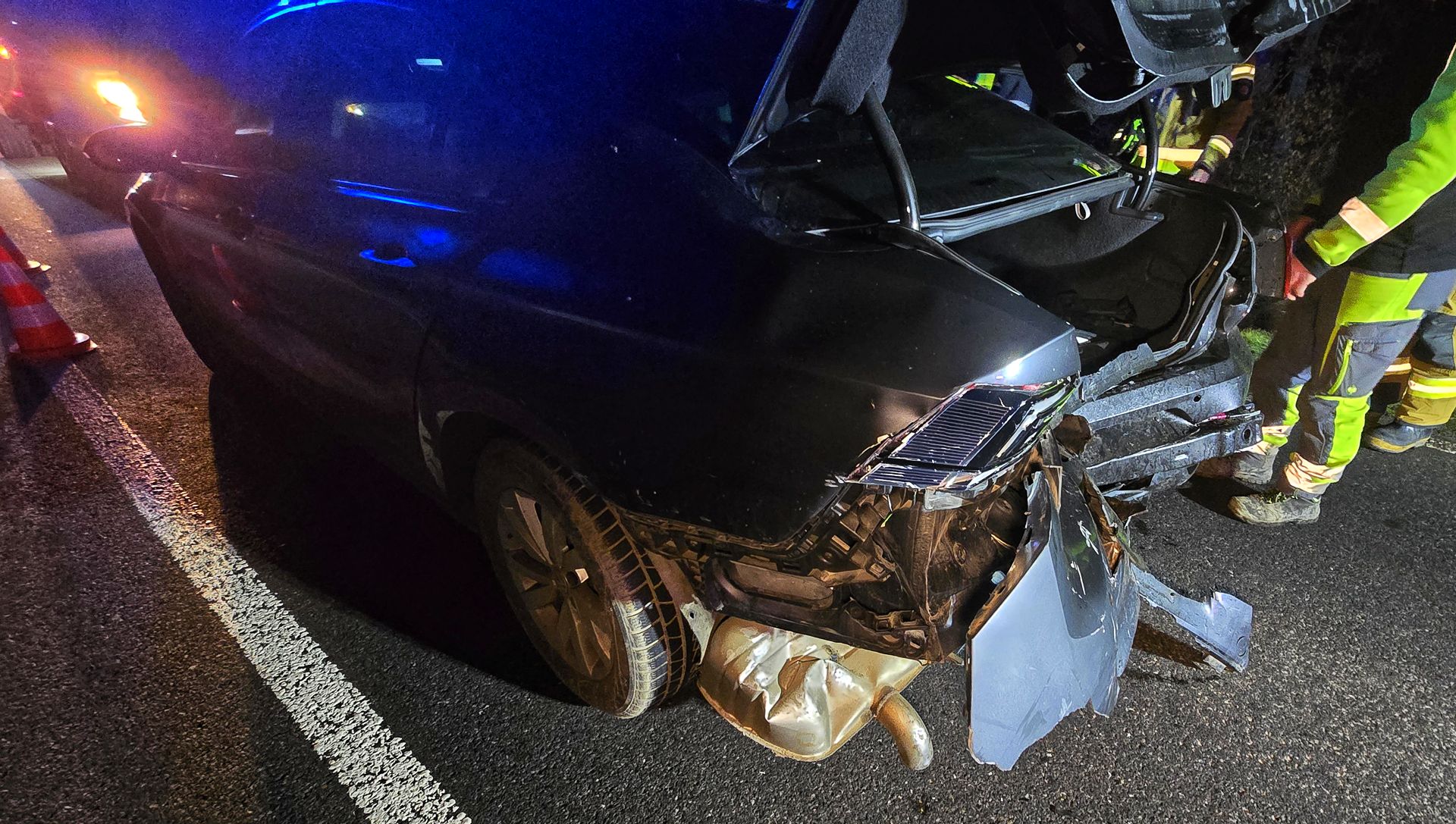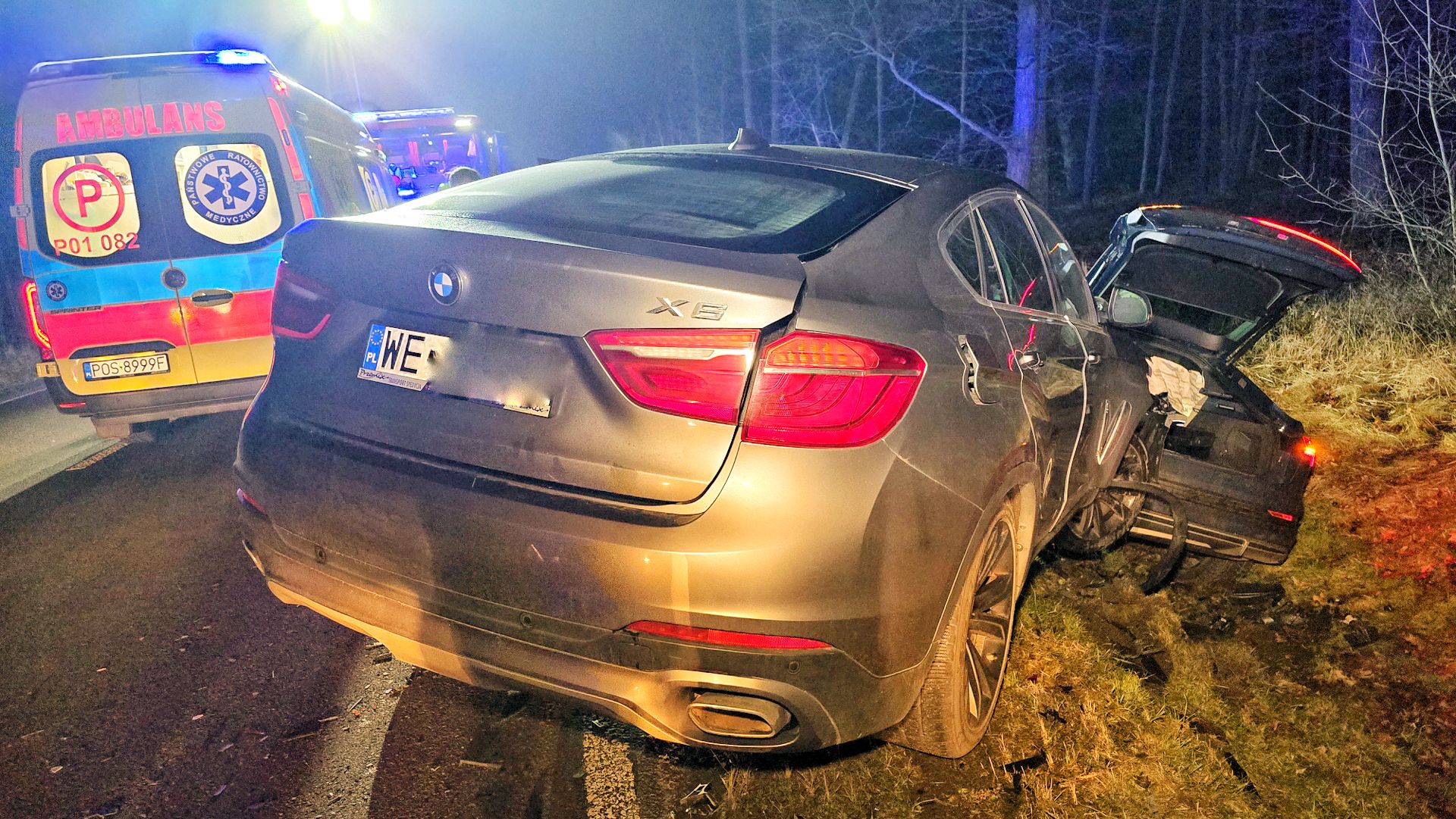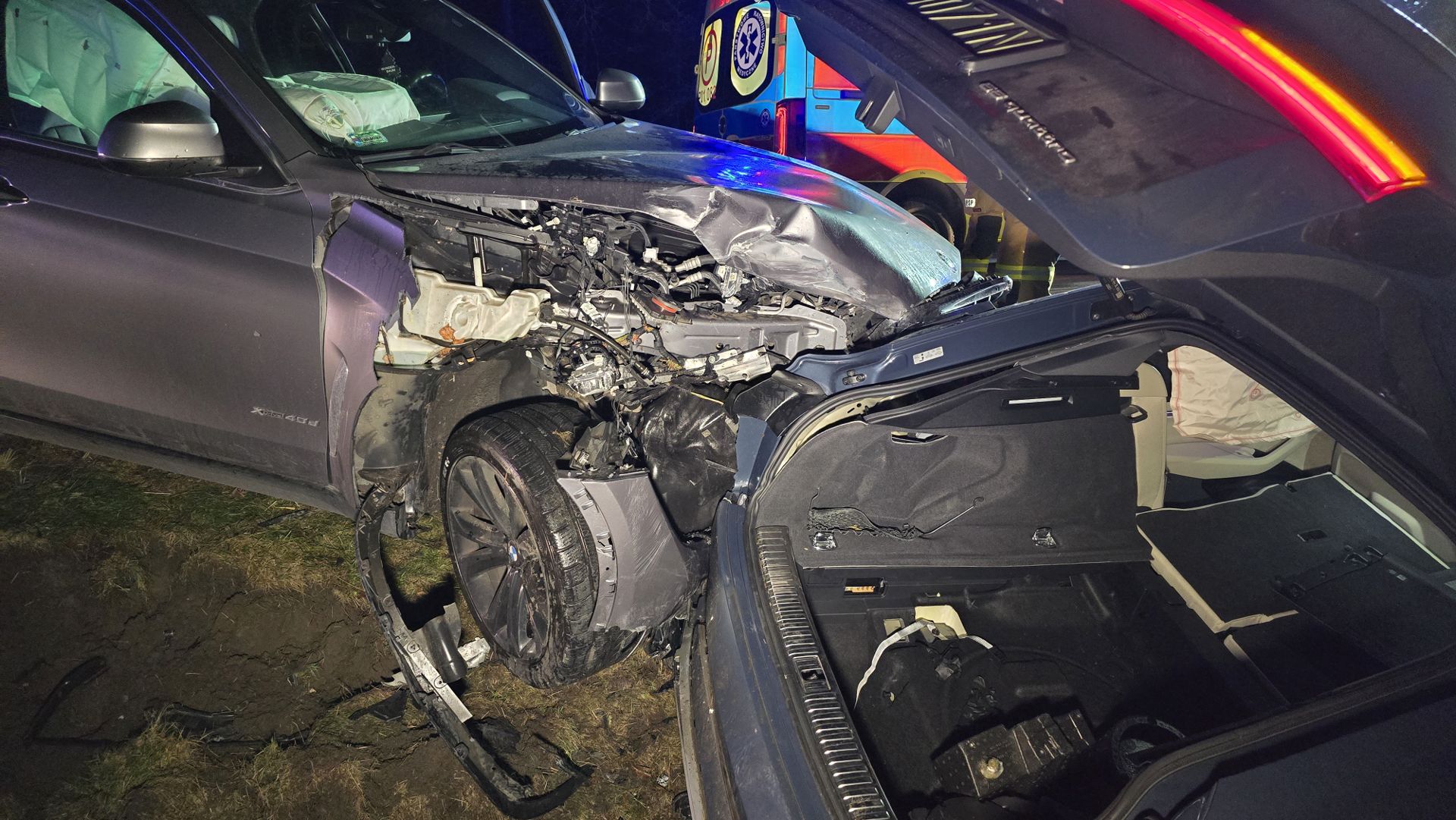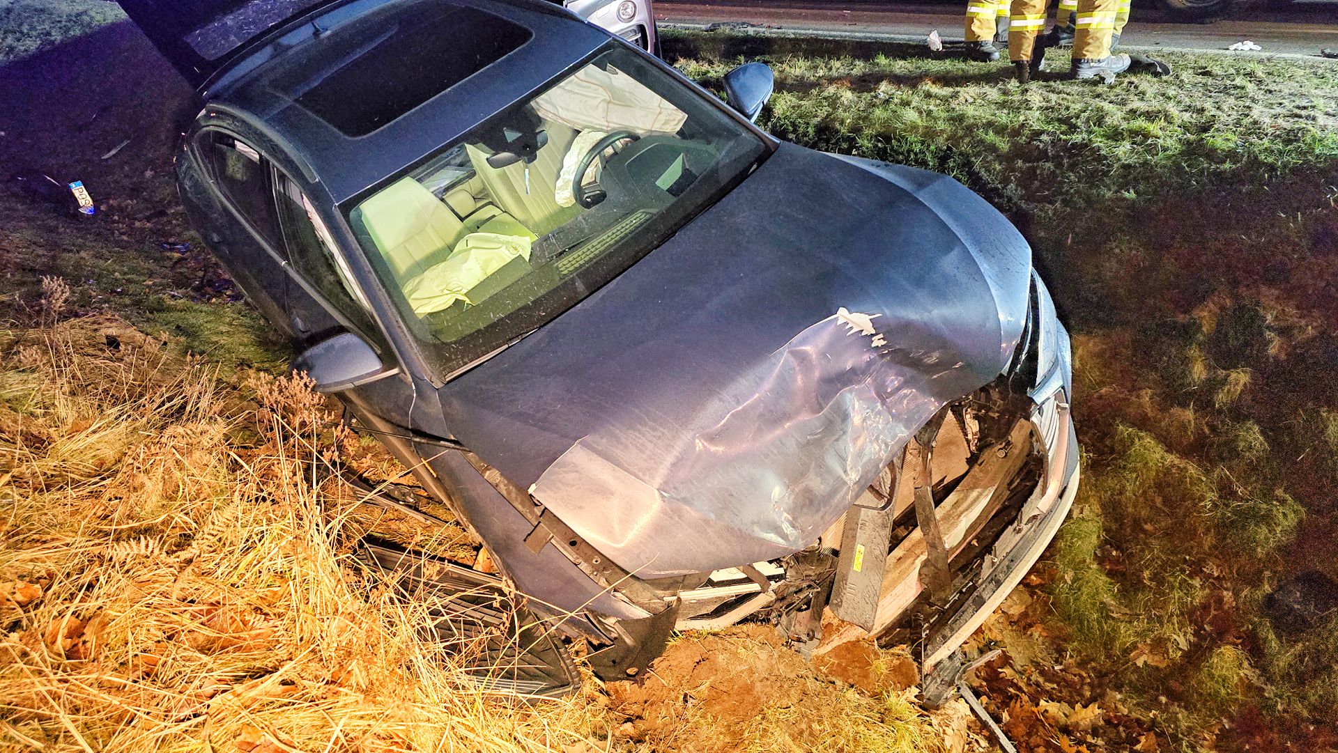 Młody kierowca Volkswagena Passata awaryjnie zahamował z powodu przebiegających saren. Za nim zatrzymał się elektrycznym Audi, ale niestety w tył Audi uderzyło BMW. Passat ma mocno uszkodzony tył, Audi przód i tył a BMW przód.