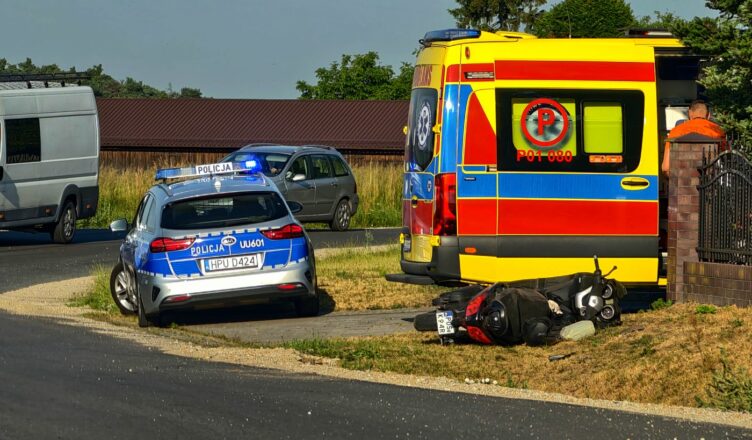 67-letni mężczyzna kierujący jednośladem doznał poważnych obrażeń. Zespół ratownictwa medycznego przetransportował poszkodowanego w stanie ciężkim do ostrowskiego szpitala – przewóz odbył się na sygnałach.