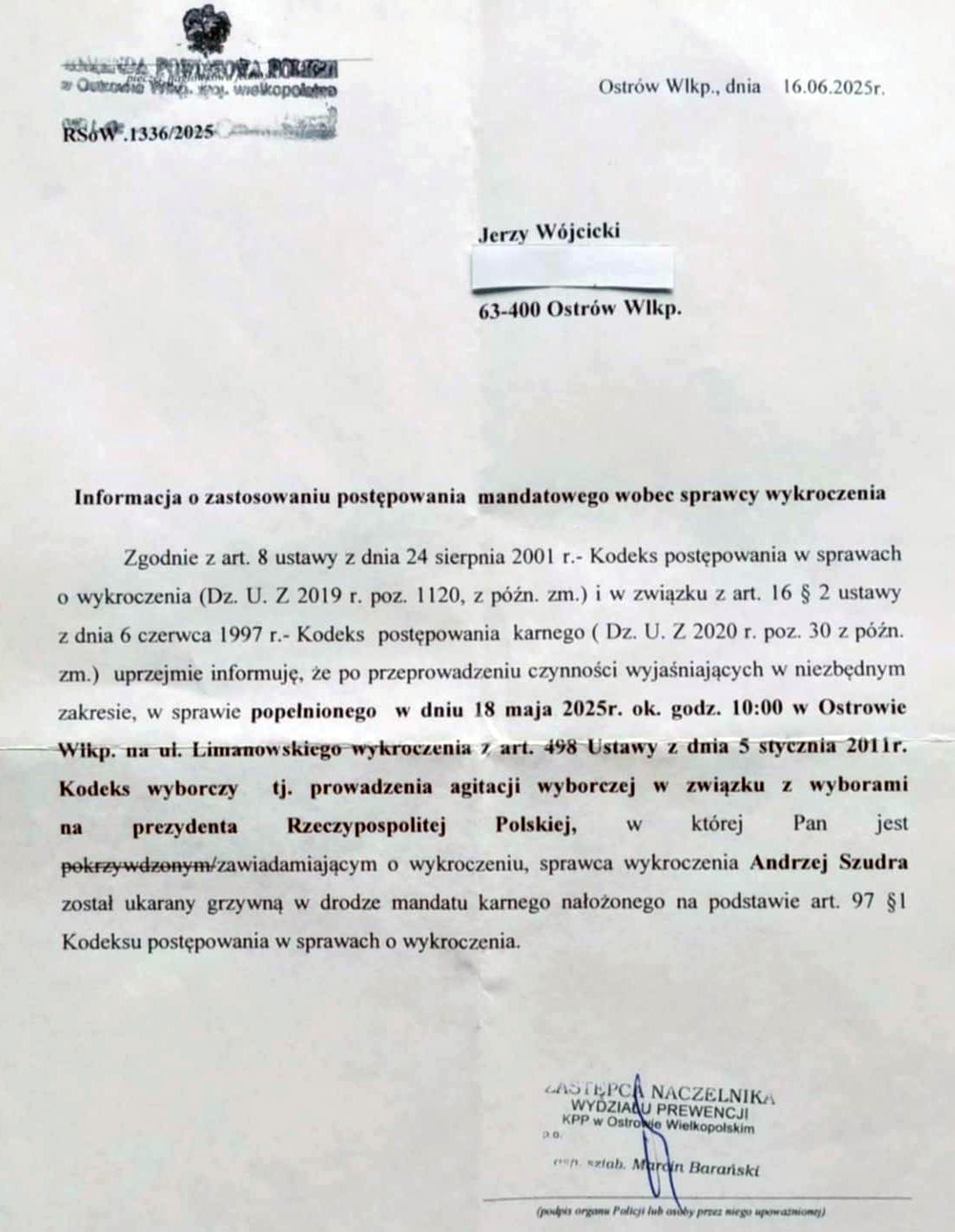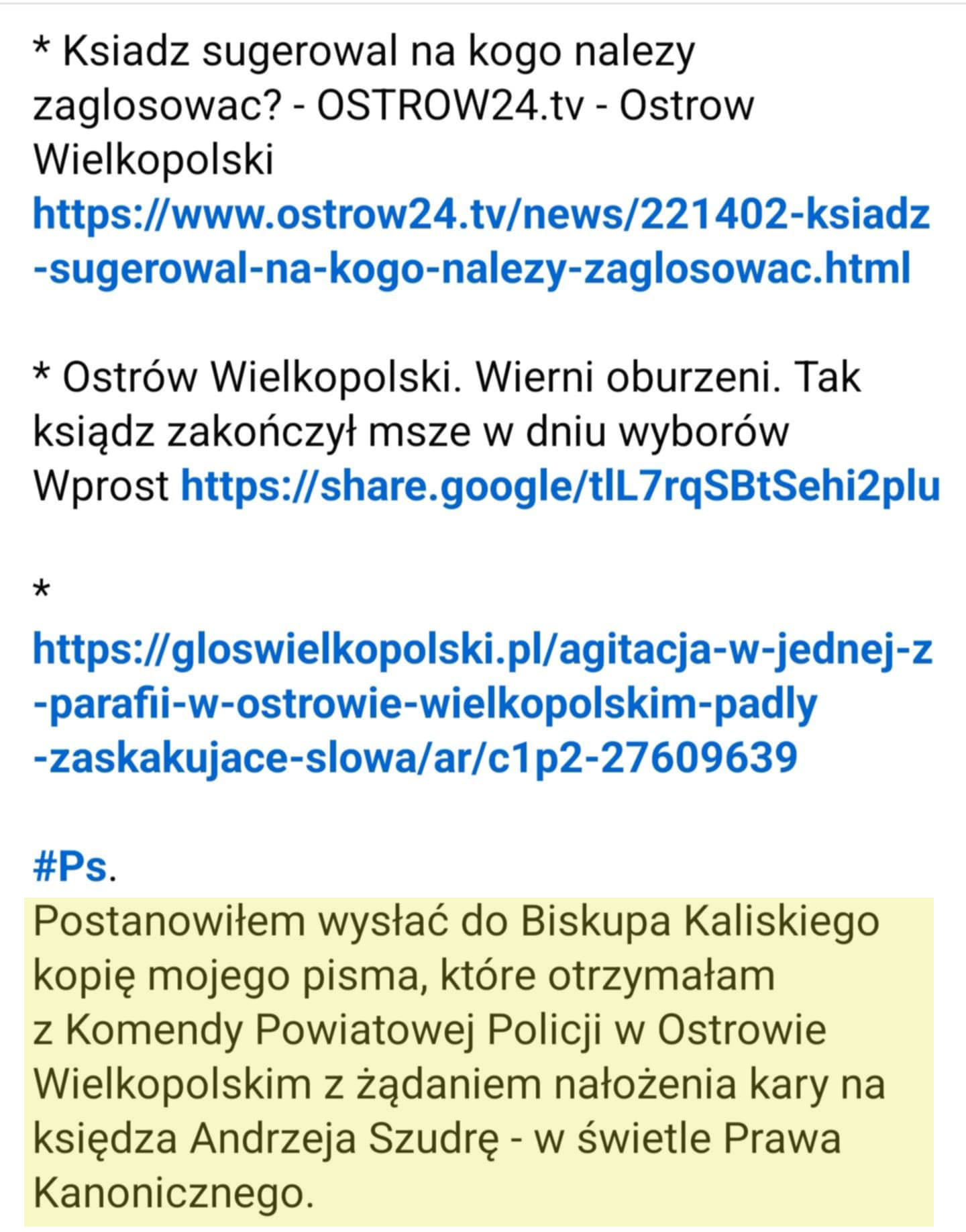Obie sytuacje miały miejsce w Ostrowie Wielkopolskim, gdzie funkcjonariuszka miejscowej komendy rozpatrywała zawiadomienie złożone przez Jerzego Wójcickiego – znanego lokalnego aktywistę, który publicznie krytykuje działania rządu PiS. Wójcicki zgłosił rzekome naruszenie ciszy wyborczej przez ks. proboszcza Andrzeja Szudrę z Sanktuarium Miłosierdzia Bożego. Duchowny, podczas kazania w czasie ciszy wyborczej, wypowiedział słowa: „Dziś też zadecydujemy, czy opowiemy się za Polską, czy za Niemcami” – co według zgłaszającego miało charakter agitacyjny.