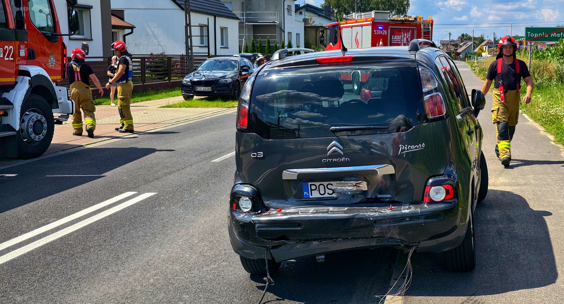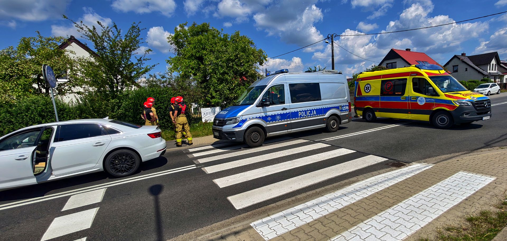 Na miejsce wysłano straż pożarną, policję oraz ostatecznie dwie karetki pogotowia ratunkowego. Pierwsza zabrała wspomniane dziecko wraz z matką, a druga przyjechała, żeby zbadać kierującą z Citroena C3 Picasso. Kobieta po przebadaniu pozostała na miejscu. Uskarżała się jedynie na ból od pasa bezpieczeństwa.