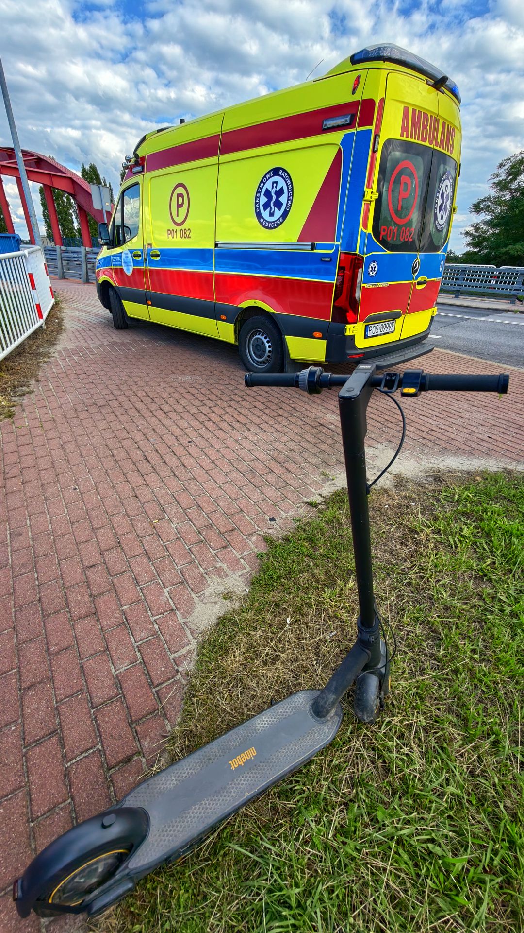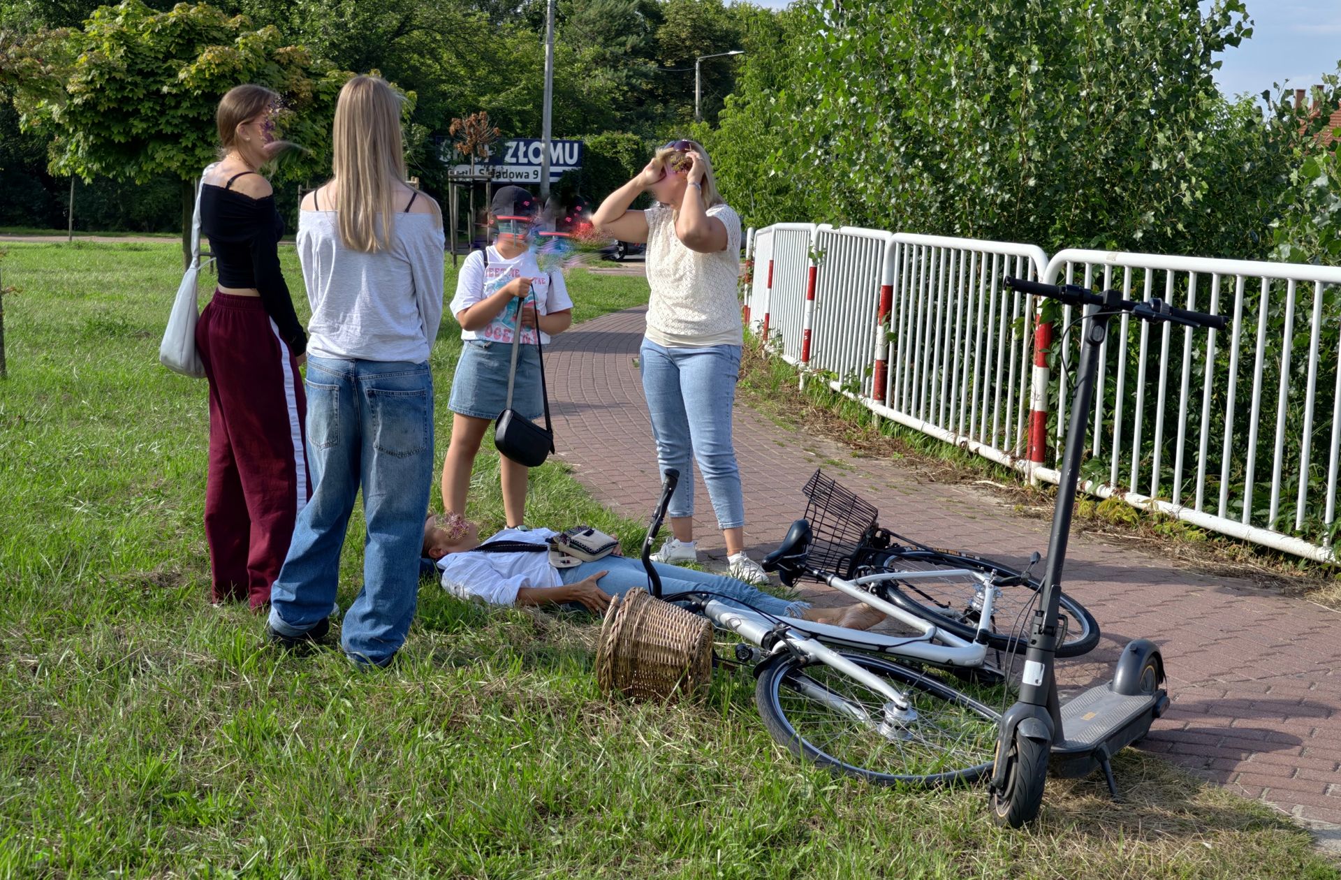 Dwie nastolatki 17- i 18-letnie jechały na jednej hulajnodze elektrycznej. Zamierzały zjechać z wiaduktu odolanowskiego w prawo w stronę ulic Składowej/Różanej. Z przeciwka jechała blisko prawej krawędzi chodnika rowerzystka. Dziewczyny na hulajnodze straciły nad nią panowanie i wjechały w przednie koło roweru. Kobieta upadła doznając bolesnego urazu prawej nogi na wysokości uda. Nastolatkom nic się nie stało. Uczestnicy mogą mówić o dużym szczęściu, bo żadna z osób nie miała założonego kasku na głowie.