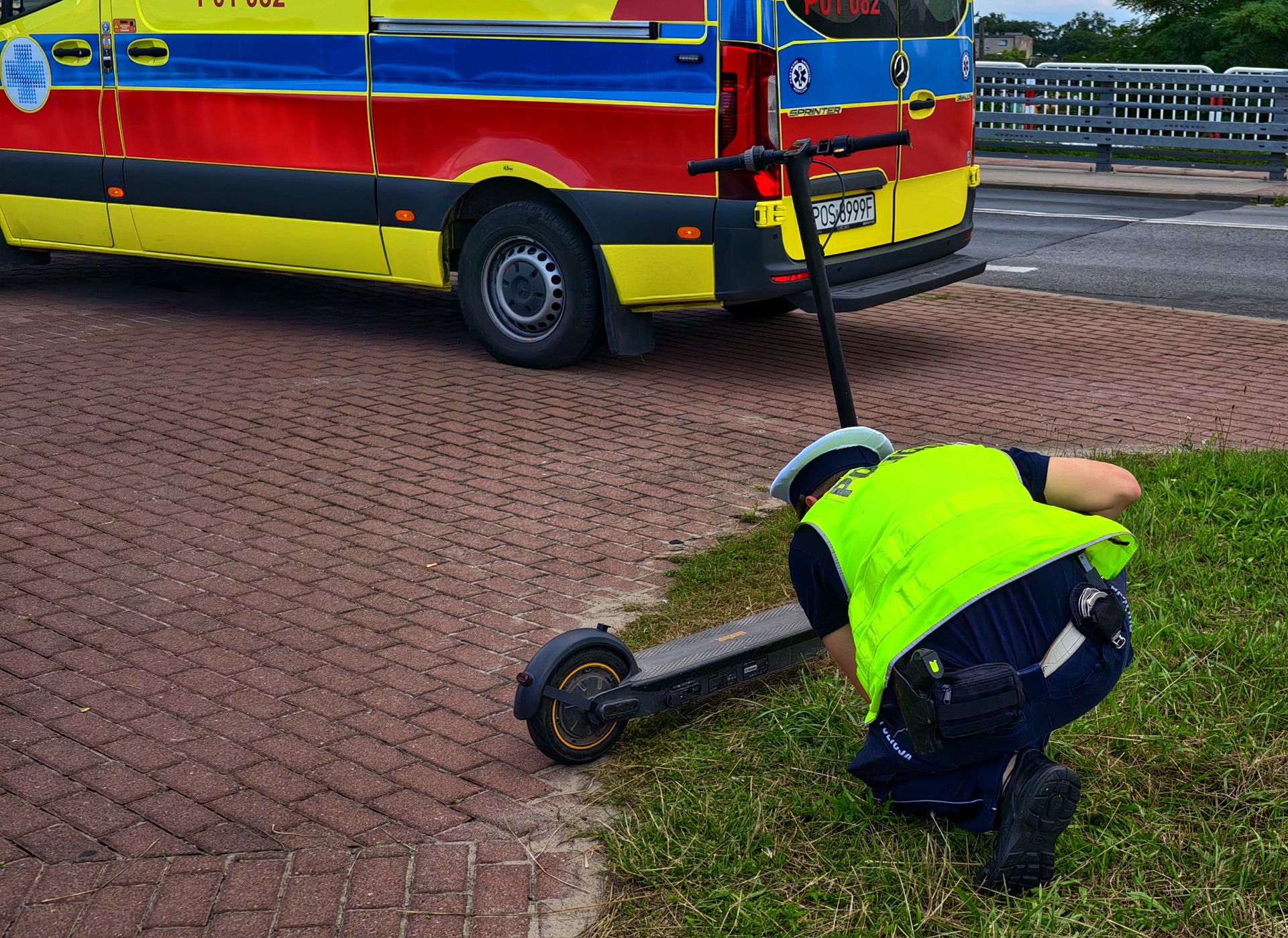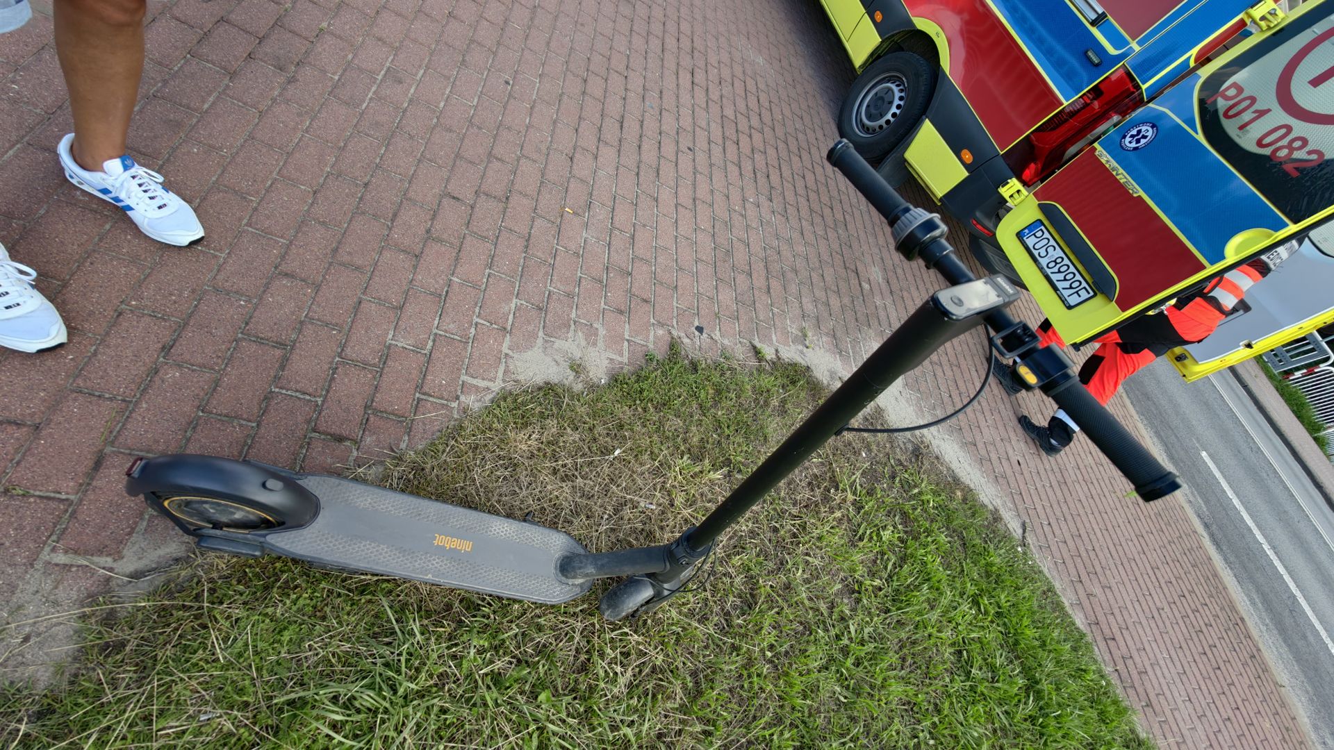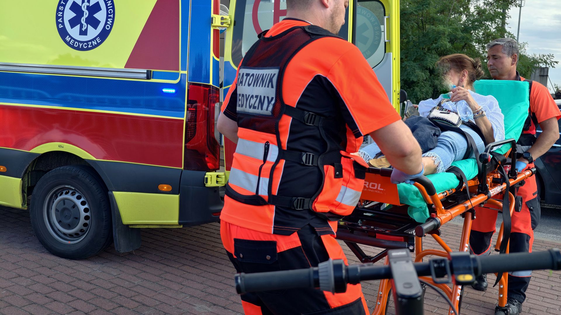 Chwilę przed godziną 17 doszło do zderzenia dwóch nastoletnich dziewczyn jadących na jednej hulajnodze z 64-letnią rowerzystką. Starsza kobieta trafiła do karetki z powodu silnego bólu prawej nogi.