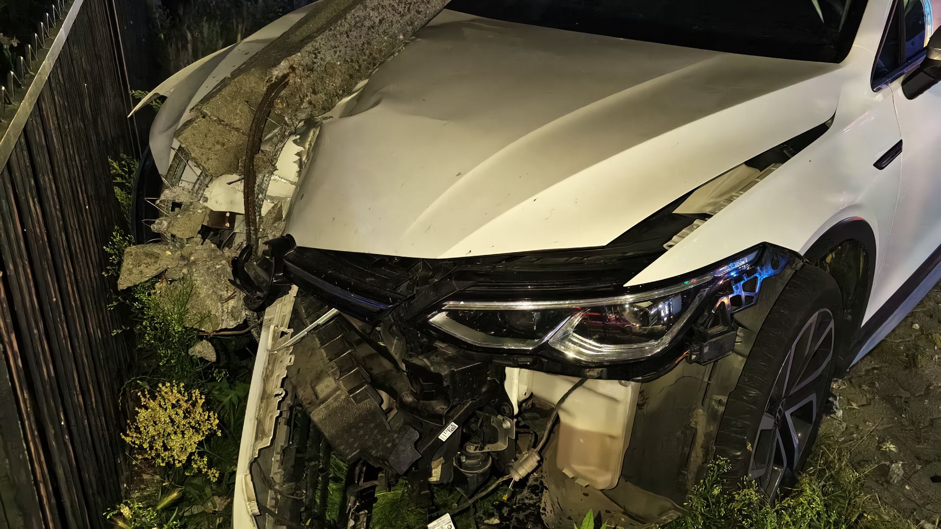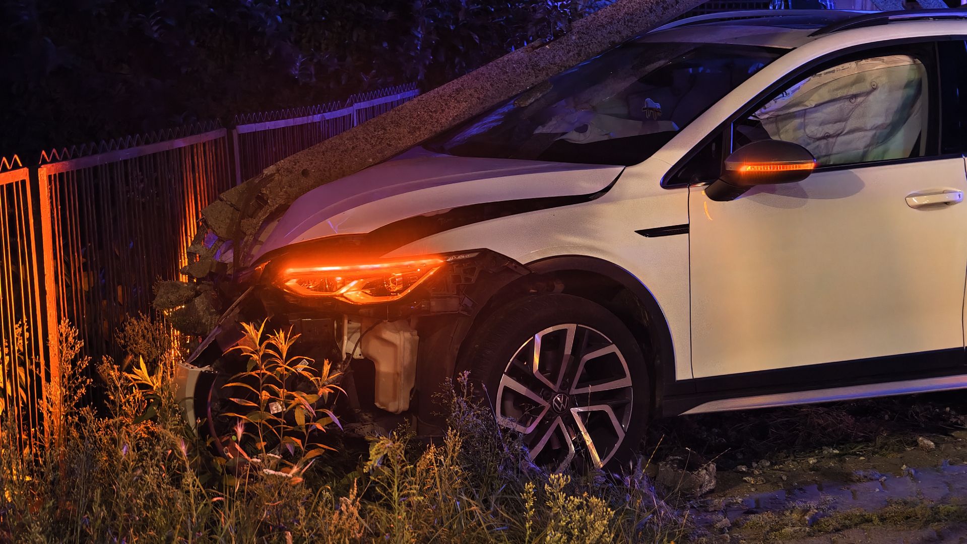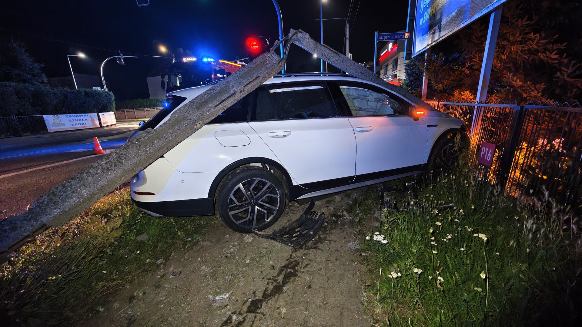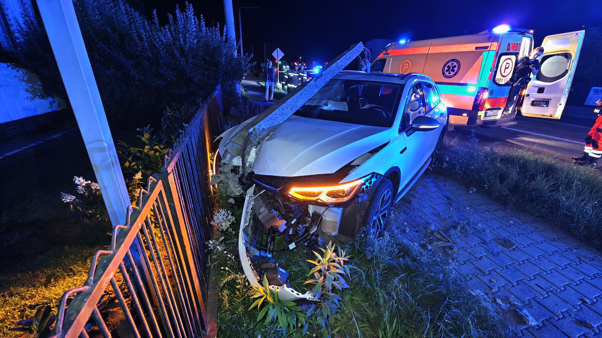Volkswagen wypadł z drogi, ściął latarnię, wjechał na chodnik i zatrzymał się przy ogrodzeniu posesji. Na miejsce wysłano służby ratunkowe. Ratownicy przebadali młodego kierowcę. Ten nie został przetransportowany do szpitala.