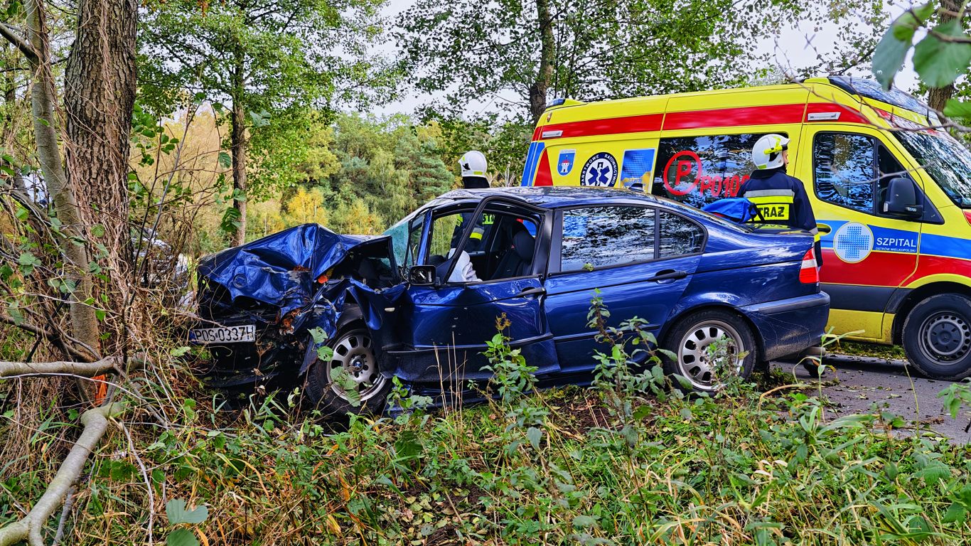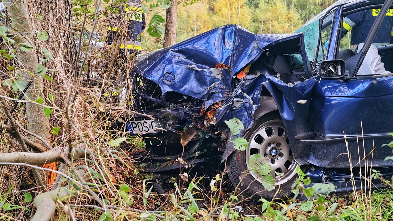 Na prostym odcinku wąskiej drogi BMW zjechało w lewą stronę i uderzyło z impetem w drzewo.