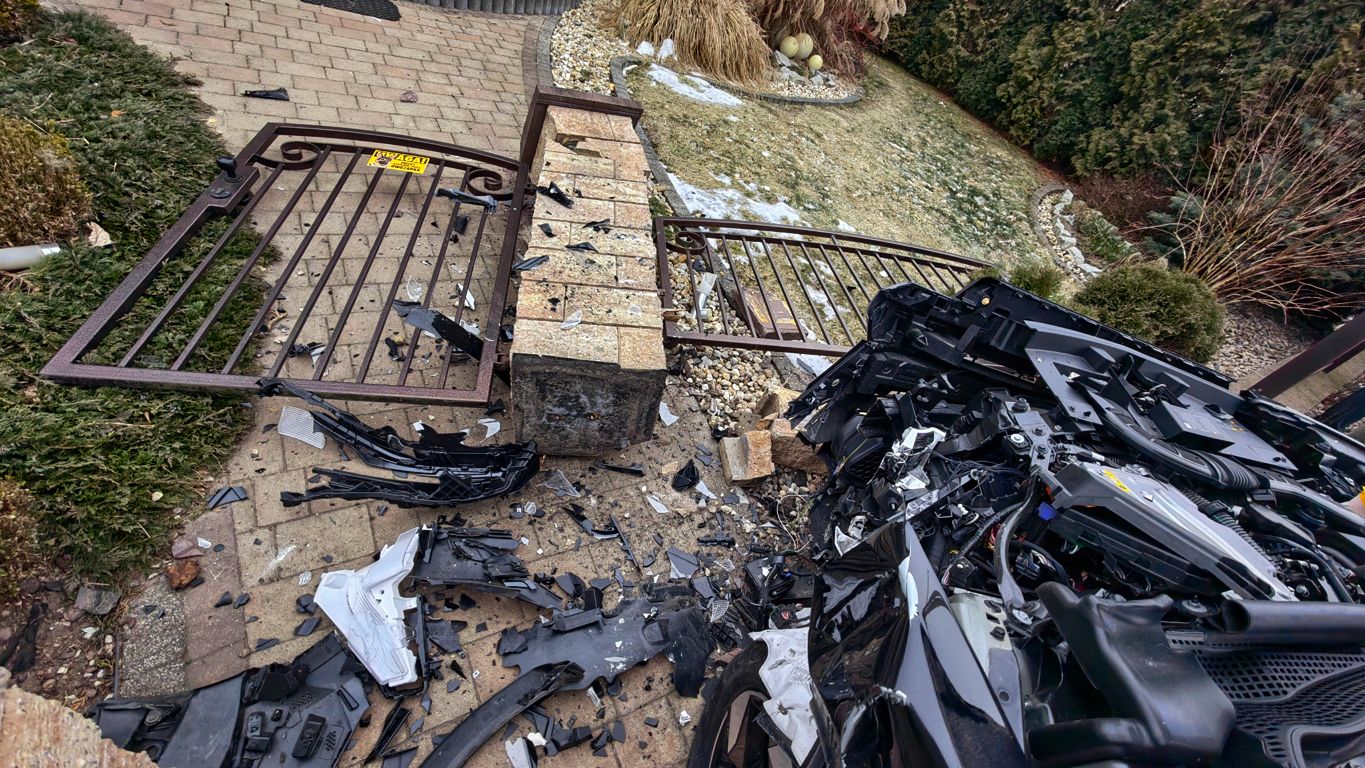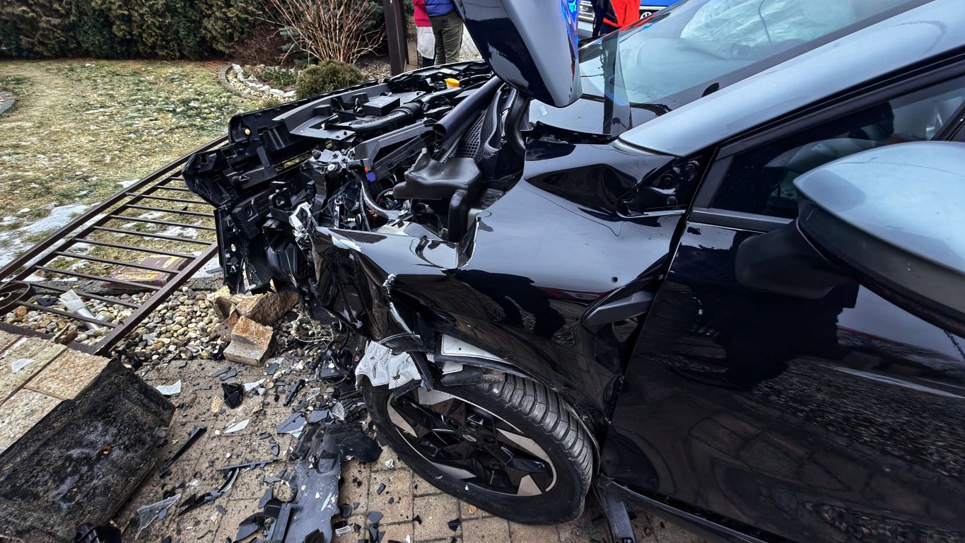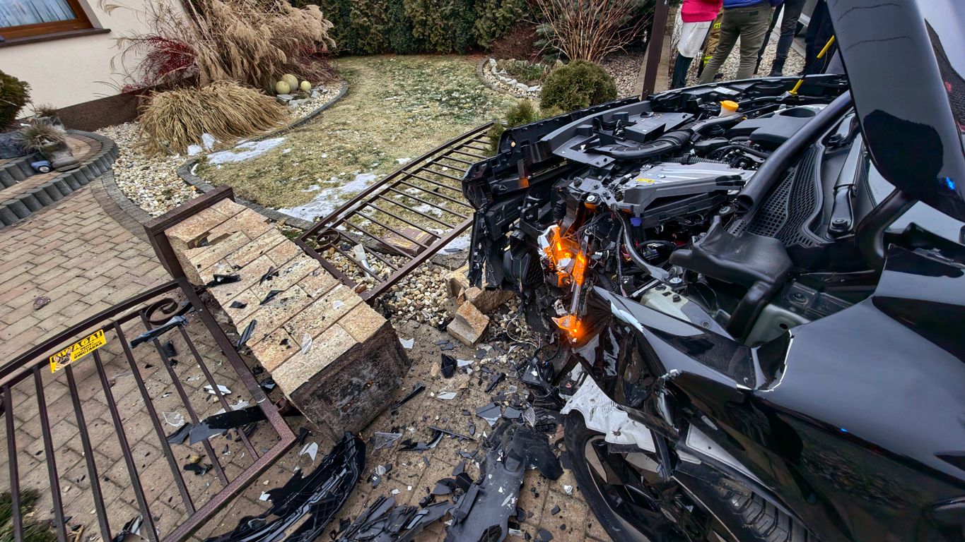 W wyniku zdarzenia samochód przewrócił część ogrodzenia. Pojazd dzięki systemowi e-call sam powiadomił o wypadku. Na miejsce dotarli policjanci, strażacy oraz karetka pogotowia ratunkowego.